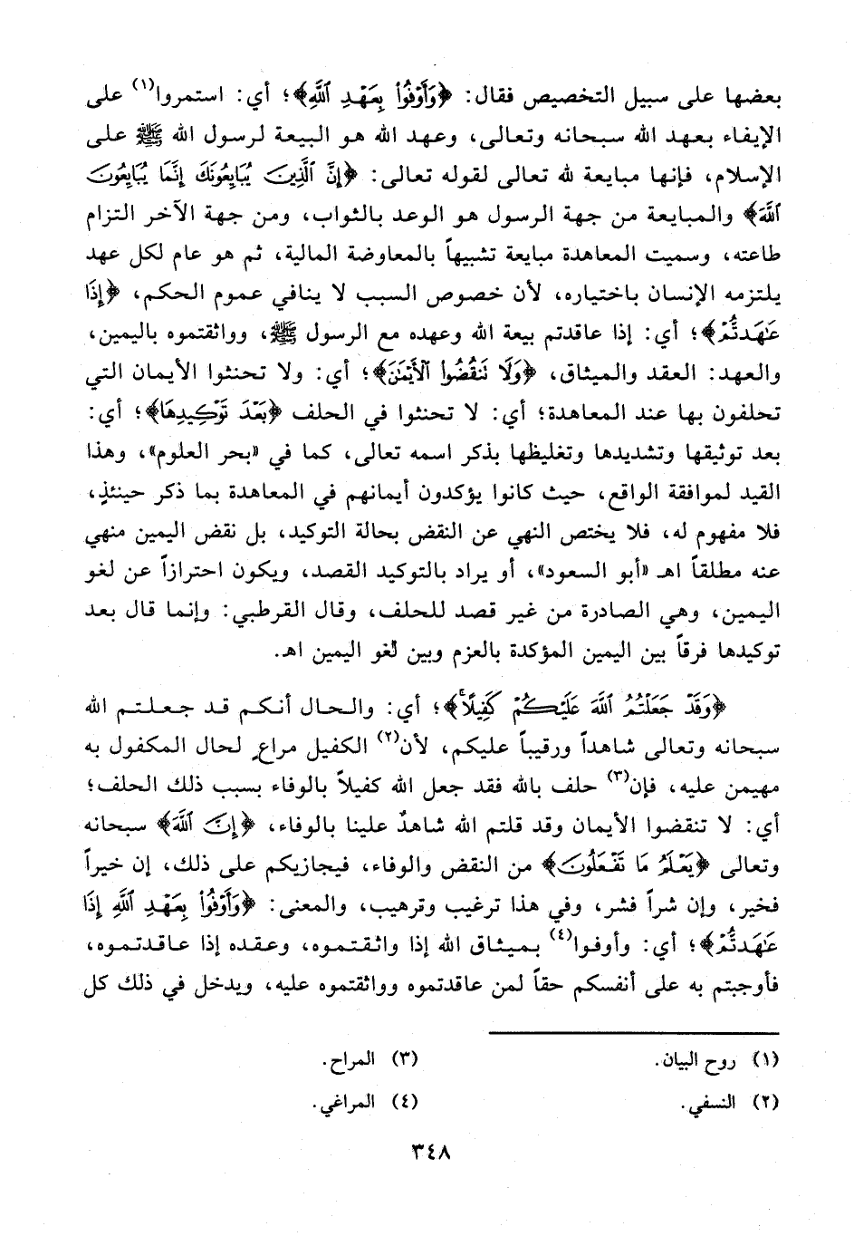 بعضها على سبيل التخصيص فقال: {وَأَوْفُوا بِعَهْدِ اللَّهِ}؛ أي: استمروا (¬1) على الإيفاء بعهد الله سبحانه وتعالى، وعهد الله هو البيعة لرسول الله - صلى الله عليه وسلم - على الإِسلام، فإنها مبايعة لله تعالى لقوله تعالى: {إِنَّ الَّذِينَ يُبَايِعُونَكَ إِنَّمَا يُبَايِعُونَ اللَّهَ} والمبايعة من جهة الرسول هو الوعد بالثواب، ومن جهة الآخر التزام طاعته، وسميت المعاهدة مبايعة تشبيهًا بالمعاوضة المالية، ثم هو عام لكل عهد يلتزمه الإنسان باختياره، لأن خصوص السبب لا ينافي عموم الحكم، {إِذَا عَاهَدْتُمْ}؛ أي: إذا عاقدتم بيعة الله وعهده مع الرسول - صلى الله عليه وسلم -، وواثقتموه باليمين، والعهد: العقد والميثاق، {وَلَا تَنْقُضُوا الْأَيْمَانَ}؛ أي: ولا تحنثوا الأيمان التي تحلفون بها عند المعاهدة؛ أي: لا تحنثوا في الحلف {بَعْدَ تَوْكِيدِهَا}؛ أي: بعد توثيقها وتشديدها وتغليظها بذكر اسمه تعالى، كما في "بحر العلوم"، وهذا القيد لموافقة الواقع، حيث كانوا يؤكدون أيمانهم في المعاهدة بما ذكر حينئذٍ، فلا مفهوم له، فلا يختص النهي عن النقض بحيالة التوكيد، بل نقض اليمين منهي عنه مطلقًا اهـ "أبو السعود"، أو يراد بالتوكيد القصد، ويكون احترازًا عن لغو اليمين، وهي الصادرة من غير قصد للحلف، وقال القرطبي: وإنما قال بعد توكيدها فرقًا بين اليمين المؤكدة بالعزم وبين لغو اليمين اهـ.