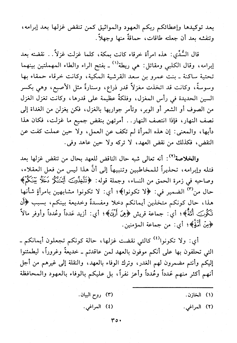 قال السُّدِّي: هذه امرأة خرقاء كانت بمكة، كلما غزلت غزلًا .. نقضته بعد إبرامه، وقال الكلبي ومقاتل: هي ريطة (¬1) - بفتح الراء والطاء المهملتين بينهما تحتية ساكنة - بنت عمرو بن سعد القرشية المكية، وكانت خرقاء حمقاء بها وسوسةٌ، وكانت قد اتخذت مغزلًا قدر ذراع، وسنارةً مثل الأصبع، وهي بكسر السين الحديدة في رأس المغزل، وفلكةً عظيمة على قدرها، وكانت تغزل الغزل من الصوف أو الشعر أو الوبر، وتأمر جواريها بالغزل، فكن يغزلن من الغداة إلى نصف النهار، فإذا انتصف النهار .. أمرتهن بنقض جميع ما غزلت، فكان هذا دأبها، والمعنى: إن هذه المرأة لم تكف عن العمل، ولا حين عملت كفت عن النقض، فكذلك من نقض العهد، لا تركه ولا حين عاهد وفى.