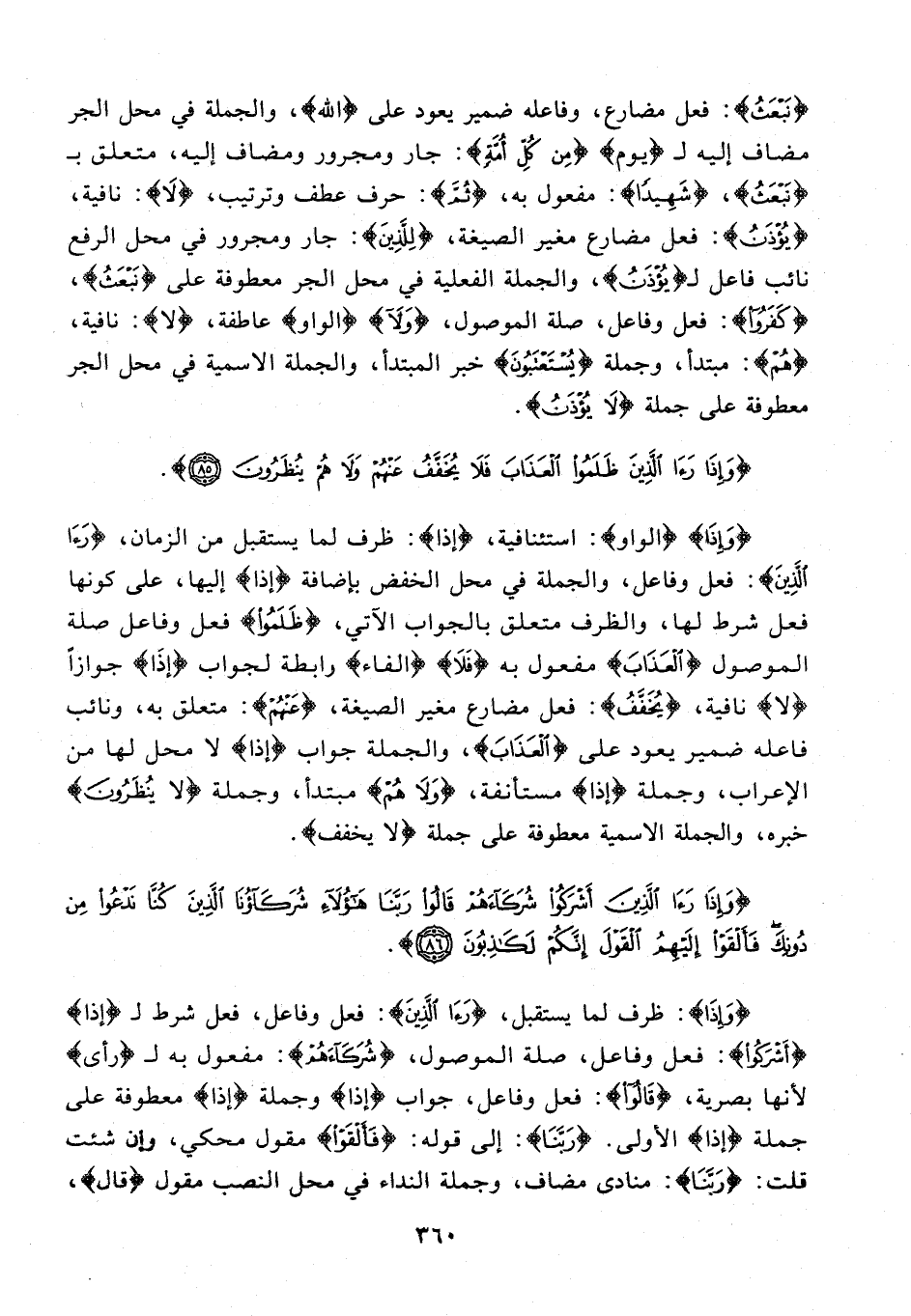 {نَبْعَثُ}: فعل مضارع، وفاعله ضمير يعود على {الله}، والجملة في محل الجر مضاف إليه لـ {يوم} {مِنْ كُلِّ أُمَّةٍ}: جار ومجرور ومضاف إليه، متعلق بـ {نبعَثُ}، {شَهِيدًا}: فعول به، {ثُمَّ}: حرف عطف وترتيب، {لَا}: نافية، {يُؤْذَنُ}: فعل مضارع مغير الصيغة، {لِلَّذِينَ}: جار ومجرور في محل الرفع نائب فاعل لـ {يُؤْذَنُ}، والجملة الفعلية في محل الجر معطوفة على {نَبْعَثُ}، {كَفَرُوا}: فعل وفاعل، صلة الموصول، {وَلَا} {الواو} عاطفة، {لا}: نافية، {هُمْ}: مبتدأ، وجملة {يُسْتَعْتَبُونَ} خبر المبتدأ، والجملة الاسمية في محل الجر معطوفة على {لَا يُؤْذَنُ}.