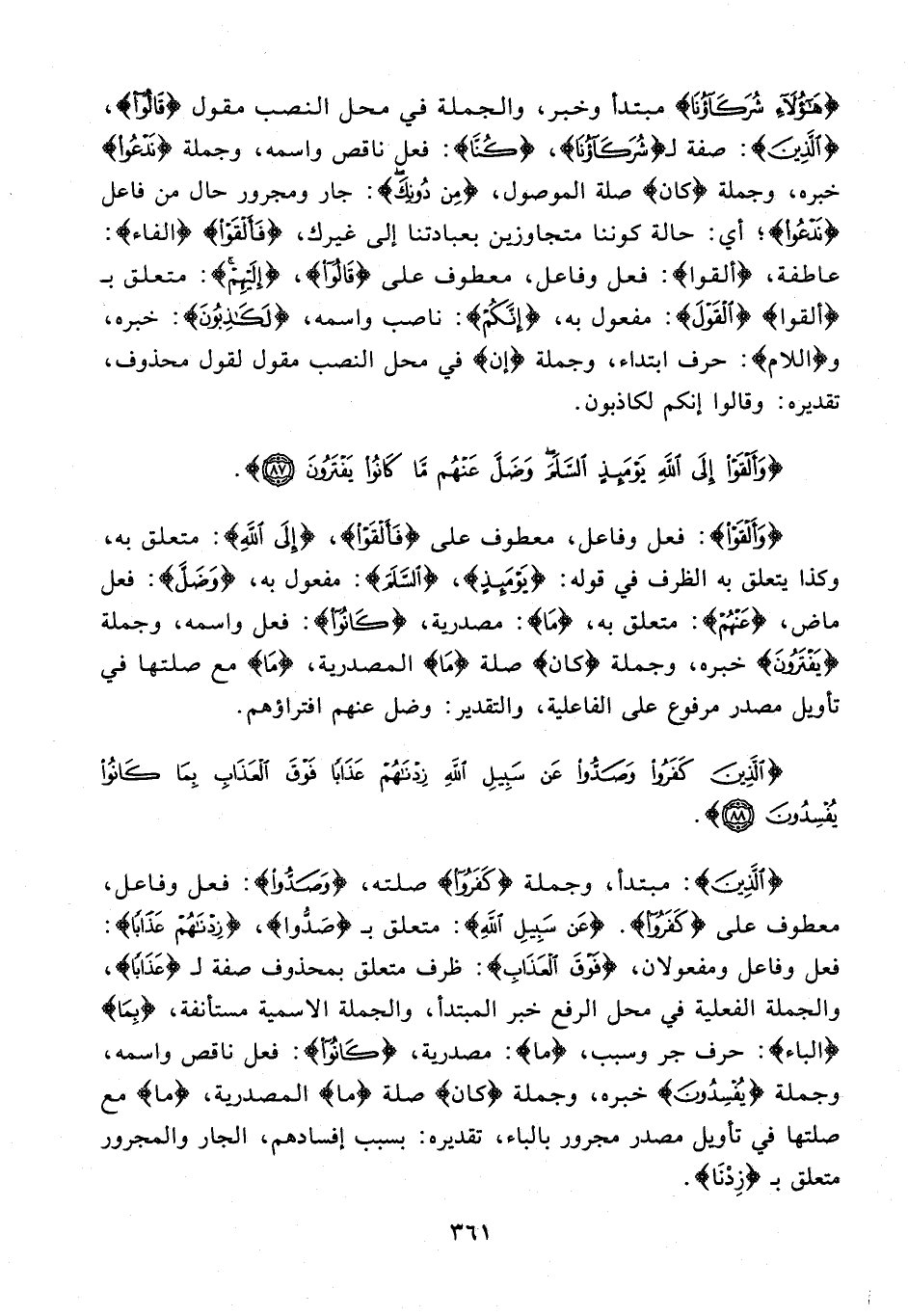 {الَّذِينَ}: مبتدأ، وجملة {كَفَرُوا} صلته، {وَصَدُّوا}: فعل وفاعل، معطوف {كَفَرُوا}. {عَنْ سَبِيلِ اللَّهِ}: متعلق بـ {وَصَدُّوا}، {زِدْنَاهُمْ عَذَابًا}: فعل وفاعل ومفعولان، {فَوْقَ الْعَذَابِ}: ظرف متعلق بمحذوف صفة لـ {عَذَابًا}، والجملة الفعلية في محل الرفع خبر المبتدأ، والجملة الاسمية مستأنفة، {بِمَا} {الباء}: حرف جر وسبب، {ما}: مصدرية، {كَانُوا}: فعل ناقص واسمه، وجملة {يُفْسِدُونَ} خبره، وجملة {كان} صلة {ما} المصدرية، {ما} مع صلتها في تأويل مصدر مجرور بالباء، تقديره: بسبب إفسادهم، الجار والمجرور متعلق بـ {زِدْنَا}.