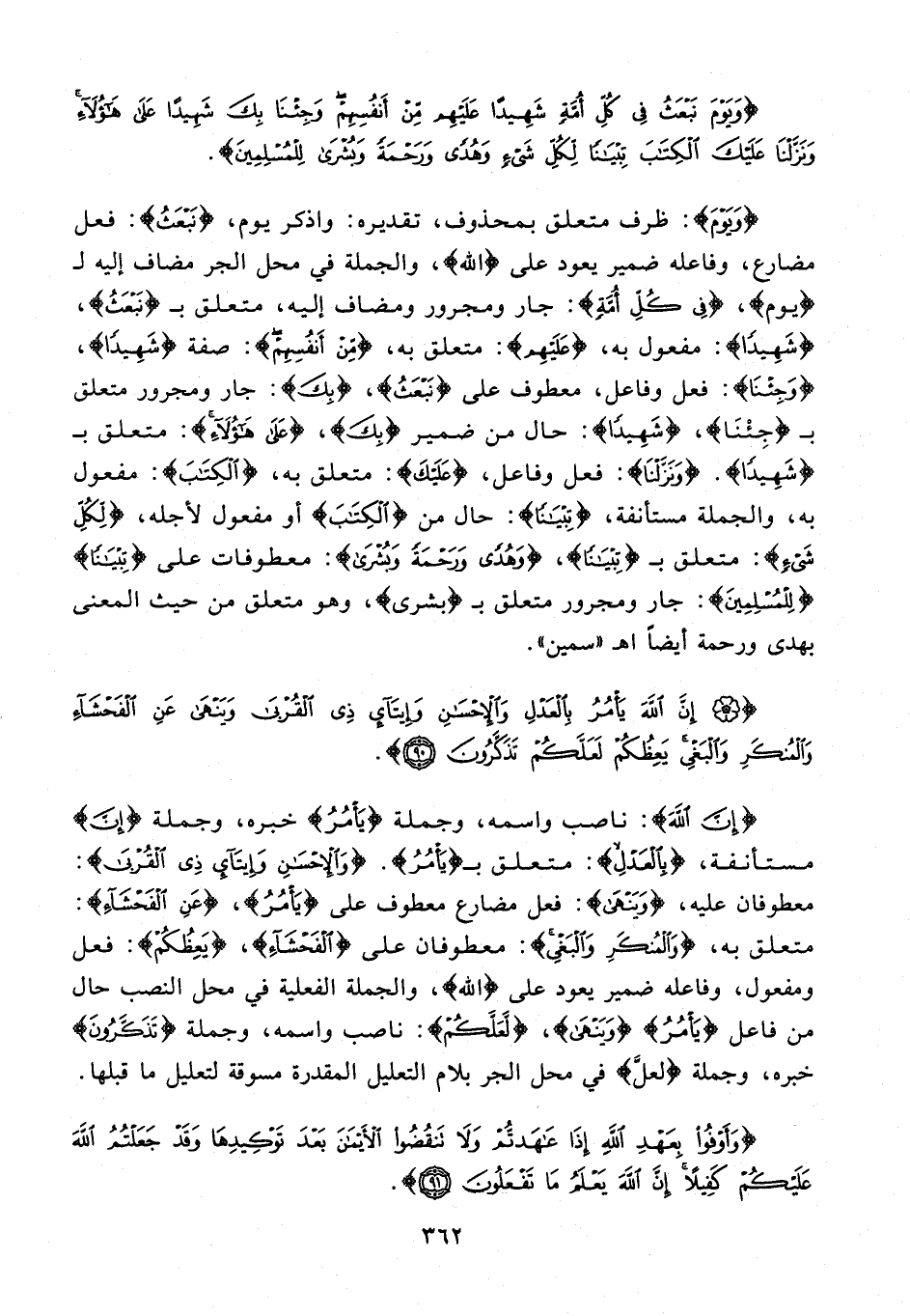 {وَيَوْمَ}: ظرف متعلق بمحذوف، تقديره: واذكر يوم، {نَبْعَثُ}: فعل مضارع، وفاعله ضمير يعود على {الله}، والجملة في محل الجر مضاف إليه لـ {يوم}، {فِي كُلِّ أُمَّةٍ}: جار ومجرور ومضاف إليه، متعلق بـ {نَبْعَثُ}، {شَهِيدًا}: مفعول به، {عَلَيْهِمْ}: متعلق به، {مِنْ أَنْفُسِهِمْ}: صفة {شَهِيدًا}، {وَجِئْنَا}: فعل وفاعل، معطوف على {نَبْعَثُ}، {بِكَ}: جار ومجرور متعلق بـ {وَجِئْنَا}، {شَهِيدًا}: حال من ضمير {بِكَ}، {عَلَى هَؤُلَاءِ}: متعلق بـ {شَهِيدًا}. {وَنَزَّلْنَا}: فعل وفاعل، {عَلَيْكَ}: متعلق به، {الْكِتَابَ}: مفعول به، والجملة مستأنفة، {تِبْيَانًا}: حال من {الْكِتَابَ} أو مفعول لأجله، {لِكُلِّ شَيْءٍ}: متعلق بـ {تِبْيَانًا}، {وَهُدًى وَرَحْمَةً وَبُشْرَى}: معطوفات على {تِبْيَانًا} {لِلْمُسْلِمِينَ}: جار ومجرور متعلق بـ {بشرى}، وهو متعلق من حيث المعنى بهدى ورحمة أيضًا اهـ "سمين".