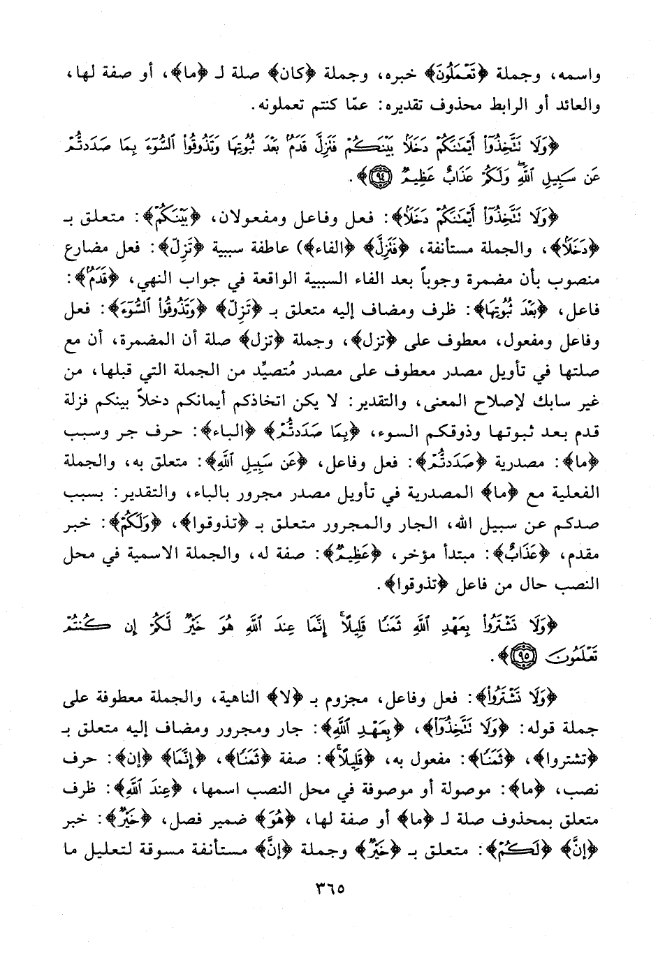 {وَلَا تَتَّخِذُوا أَيْمَانَكُمْ دَخَلًا}: فعل وفاعل ومفعولان، {بَيْنَكُمْ}: متعلق بـ {دَخَلًا}، والجملة مستأنفة، {فَتَزِلَّ} {الفاء}) عاطفة سببية {تَزِلَّ}: فعل مضارع منصوب بأن مضمرة وجوبًا بعد الفاء السببية الواقعة في جواب النهي، {قَدَمٌ}: فاعل، {بَعْدَ ثُبُوتِهَا}: ظرف ومضاف إليه متعلق بـ {تَزِلَّ} {وَتَذُوقُوا السُّوءَ}: فعل وفاعل ومفعول، معطوف على {تزل}، وجملة {تزل} صلة أن المضمرة، أن مع صلتها في تأويل مصدر معطوف على مصدر مُتصيِّد من الجملة التي قبلها، من غير سابك لإصلاح المعنى، والتقدير: لا يكن اتخاذكم أيمانكم دخلًا بينكم فزلة قدم بعد ثبوتها وذوقكم السوء، {بِمَا صَدَدْتُمْ} {الباء}: حرف جر وسبب {ما}: مصدرية {صَدَدْتُمْ}: فعل وفاعل، {عَنْ سَبِيلِ اللَّهِ}: متعلق به، والجملة الفعلية مع {ما} المصدرية في تأويل مصدر مجرور بالباء، والتقدير: بسبب صدكم عن سبيل الله، الجار والمجرور متعلق بـ {تذوقوا}، {وَلَكُمْ}: خبر مقدم، {عَذَابٌ}: مبتدأ مؤخر، {عَظِيمٌ}: صفة له، والجملة الاسمية في محل النصب حال من فاعل {تذوقوا}.