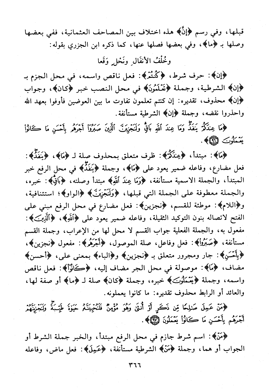 {مَا}: مبتدأ، {عِنْدَكُمْ}: ظرف متعلق بمحذوف صله لـ {مَا}، {يَنْفَدُ}: فعل مضارع، وفاعله ضمير يعود على {مَا}، وجملة {يَنْفَدُ} في محل الرفع خبر المبتدأ، والجملة الاسمية مستأنفة، {وَمَا عِنْدَ اللَّهِ} مبتدأ وصلته، {بَاقٍ}: خبره، والجملة معطوفة على الجملة التي قبلها، {وَلَنَجْزِيَنَّ} {الواو}؛ استئنافية، {اللام}: موطئة للقسم، {نجزين}: فعل مضارع في محل الرفع مبني على الفتح لاتصاله بنون التوكيد الثقيلة، وفاعله ضمير يعود على {اللَّهِ}، {الَّذِينَ}: مفعول به، والجملة الفعلية جواب القسم لا محل لها من الإعراب، وجملة القسم مستأنفة، {صَبَرُوا}: فعل وفاعل، صلة الموصول، {أَجْرَهُمْ}: مفعول {نجزين}، {بِأَحْسَنِ}: جار ومجرور متعلق بـ {نجزين} و {الباء} بمعنى على، {أحسن} مضاف، {مَا}: موصولة في محل الجر مضاف إليه، {كَانُوا}: فعل ناقص واسمه، وجملة {يَعْمَلُونَ} خبره، وجملة {كان} صلة لـ {ما} أو صفة لها، والعائد أو الرابط محذوف تقديره: ما كانوا يعملونه.