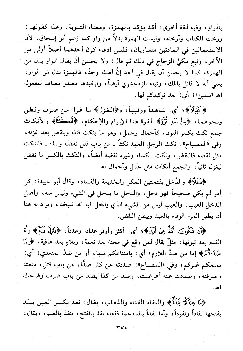 {كَفِيلًا}؛ أي: شاهدًا ورقيبًا، و {الغزل} ما غزل من صوف وقطن ونحوهما، {مِنْ بَعْدِ قُوَّةٍ} القوة هنا الإبرام والإحكام، {أَنْكَاثًا} والأنكاث جمع نكث بكسر النون، كأحمال وحمل، وهو ما ينكث فتله وينقض بعد غزله، وفي "المصباح": نكث الرجل العهد نكثًا - من باب قتل نقضه ونبذه - فانتكث مثل نقضه فانتقض، ونكث الكساء وغيره نقضه أيضًا، والنكث بالكسر ما نقض ليغزل ثانيًا، والجمع أنكاث مثل حمل وأحمال اهـ.