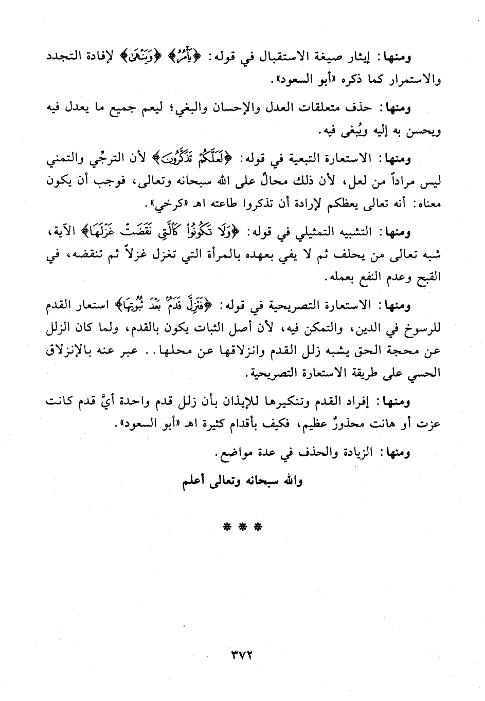 ومنها: الاستعارة التصريحية في قوله: {فَتَزِلَّ قَدَمٌ بَعْدَ ثُبُوتِهَا} استعار القدم للرسوخ في الدين، والتمكن فيه، لأن أصل الثبات يكون بالقدم، ولما كان الزلل عن محجة الحق يشبه زلل القدم وانزلاقها عن محلها .. عبر عنه بالإنزلاق الحسي على طريقة الاستعارة التصريحية.