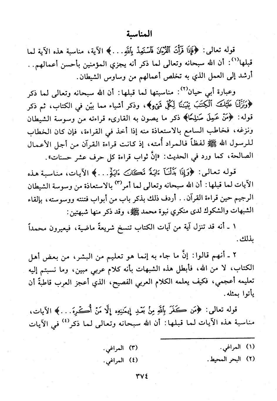 وعبارة أبي حيان (¬2): مناسبتها لما قبلها: أن الله سبحانه وتعالى لما ذكر {وَنَزَّلْنَا عَلَيْكَ الْكِتَابَ تِبْيَانًا لِكُلِّ شَيْءٍ}، وذكر أشياء مما بيّن في الكتاب، ثم ذكر قوله: {مَنْ عَمِلَ صَالِحًا} ذكر ما يصون به القارئ قراءته من وسوسة الشيطان ونزغه، فخاطب السامع بالاستعاذة منه إذا أخذ في القراءة، فإن كان الخطاب لرسول الله - صلى الله عليه وسلم - لفظًا فالمراد أُمته، إذ كانت قراءة القرآن من أجل الأعمال الصالحة، كما ورد في الحديث: "إنَّ ثواب قراءة كل حرف عشر حسنات".