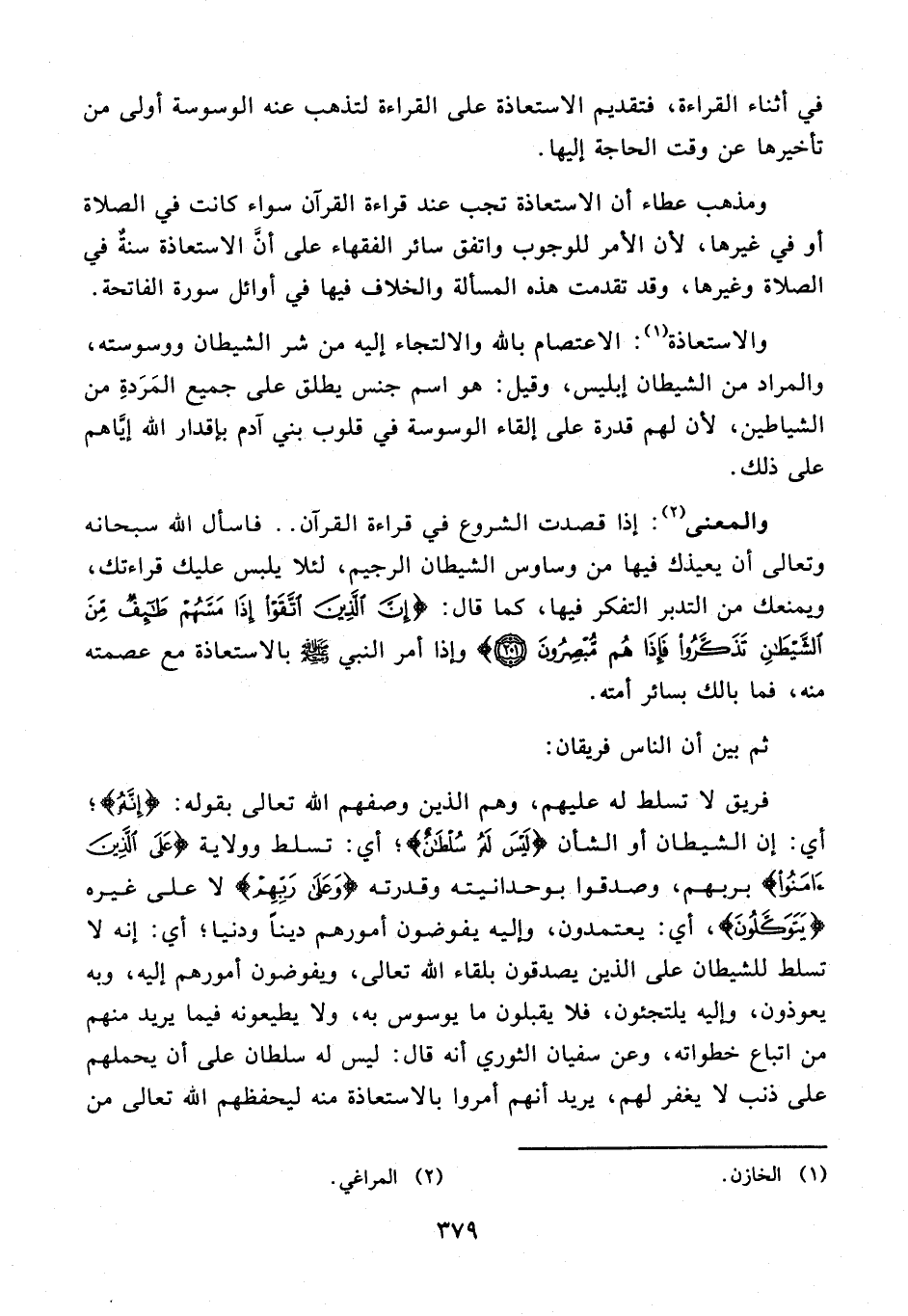 والمعنى (¬2): إذا قصدت الشروع في قراءة القرآن .. فاسأل الله سبحانه وتعالى أن يعيذك فيها من وساوس الشيطان الرجيم، لئلا يلبس عليك قراءتك، ويمنعك من التدبر التفكر فيها، كما قال: {إِنَّ الَّذِينَ اتَّقَوْا إِذَا مَسَّهُمْ طَائِفٌ مِنَ الشَّيْطَانِ تَذَكَّرُوا فَإِذَا هُمْ مُبْصِرُونَ (201)} لماذا أمر النبي - صلى الله عليه وسلم - بالاستعاذة مع عصمته منه، فما بالك بسائر أمته.