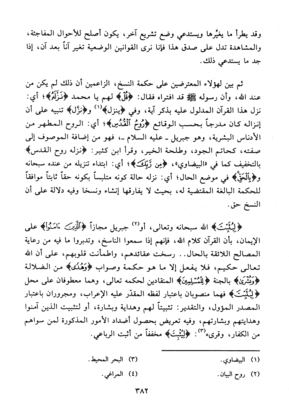 102 - ثم بين لهؤلاء المعترضين على حكمة النسخ، الزاعمين أن ذلك لم يكن من عند الله، وأن رسوله - صلى الله عليه وسلم - قد افتراه فقال: {قُل} لهم يا محمَّد {نَزَّلَهُ}؛ أي: نزل هذا القرآن المدلول عليه بذكر آية، وفي {ينزل} (¬1) و {نزَّل} تنبيه على أن إنزاله كان مدرجًا بحسب الوقائع {رُوحُ الْقُدُسِ}؛ أي: الروح المطهر من الأدناس البشرية، وهو جبريل - عليه السلام -، فهو من إضافة الموصوف إلى صفته، كحاتم الجود، وطلحة الخير، وقرأ ابن كثير: {نزله روح القدس} بالتخفيف كما في "البيضاوي"، {مِنْ رَبِّكَ}؛ أي: ابتداء تنزيله من عنده سبحانه و {بِالْحَقِّ} في موضع الحال؛ أي: نزله حالة كونه متلبسًا بكونه حقًّا ثابتًا موافقًا للحكمة البالغة المقتضية له، بحيث لا يفارقها إنشاء ونسخا وفيه دلالة على أن النسخ حق.