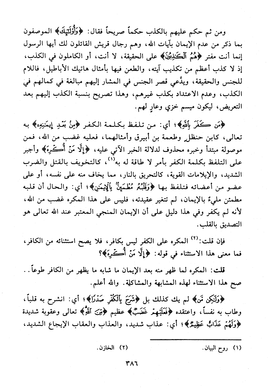 106 - {مَنْ كَفَرَ بِاللَّهِ}؛ أي: من تلفظ بكلمة الكفر {مِنْ بَعْدِ إِيمَانِهِ} به تعالى، كابن حنظلٍ وطعمة بن أبيرق وأمثالهما، فعليه غضب من الله، فمن موصولة مبتدأ وخبره محذوف لدلالة الخبر الآتي عليه، {إِلَّا مَنْ أُكْرِهَ} وأجبر على التلفظ بكلمة الكفر بأمر لا طاقة له به (¬1)، كالتخويف بالقتل والضرب الشديد، والإيلامات القوية، كالتحريق بالنار، مما يخاف منه على نفسه، أو على عضو من أعضائه فتلفظ بها {وَقَلْبُهُ مُطْمَئِنٌّ بِالْإِيمَانِ}؛ أي: والحال أن قلبه مطمئن مليءٌ بالإيمان، لم تتغير عقيدته، فليس على هذا المكره غضب من الله، لأنه لم يكفر وفي هذا دليل على أن الإيمان المنجي المعتبر عند الله تعالى هو التصديق بالقلب.