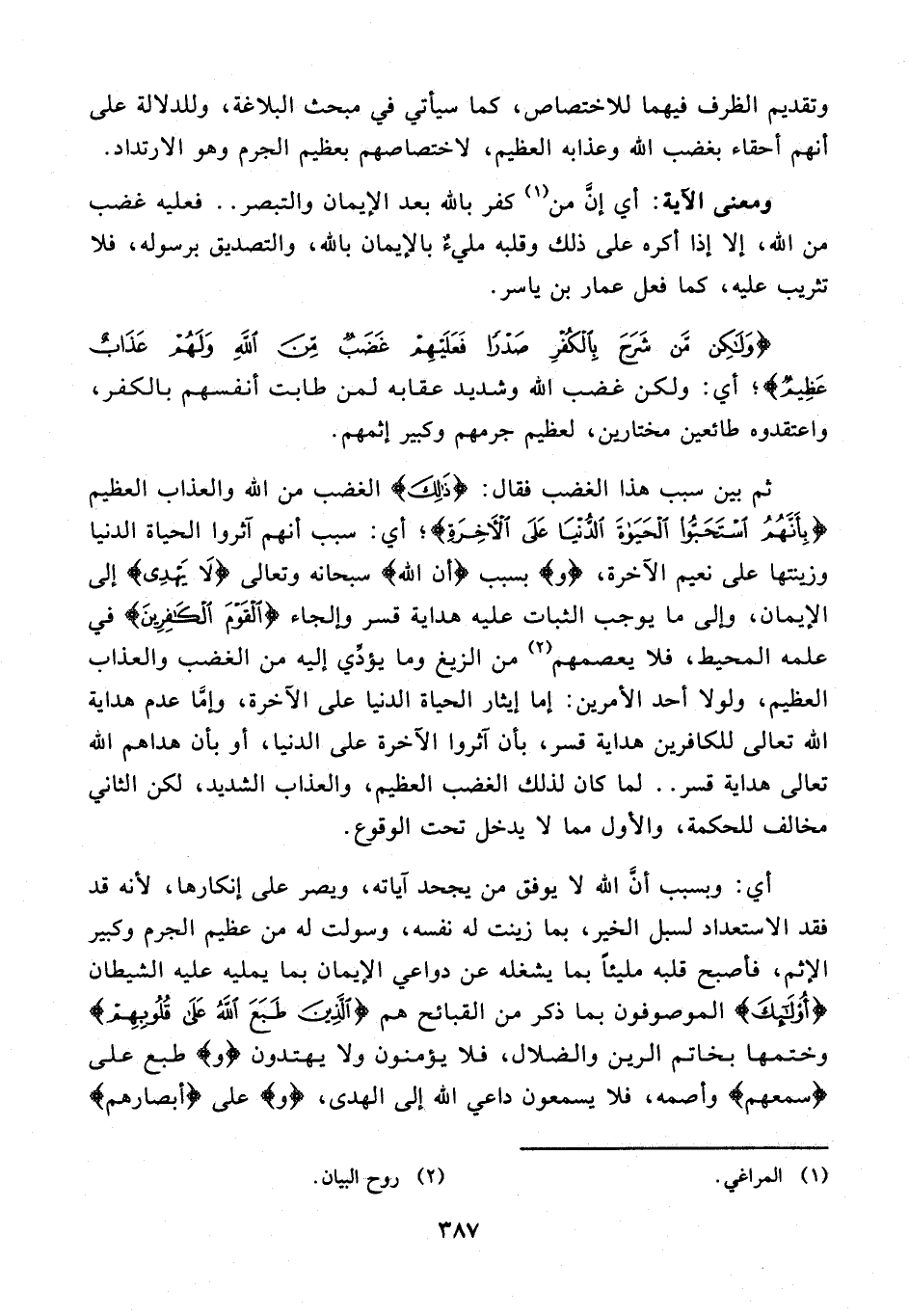 ومعنى الآية: أي إنَّ من (¬1) كفر بالله بعد الإيمان والتبصر .. فعليه غضب من الله، إلا إذا أكره على ذلك وقلبه مليءٌ بالإيمان بالله، والتصديق برسوله، فلا تثريب عليه، كما فعل عمار بن ياسر.