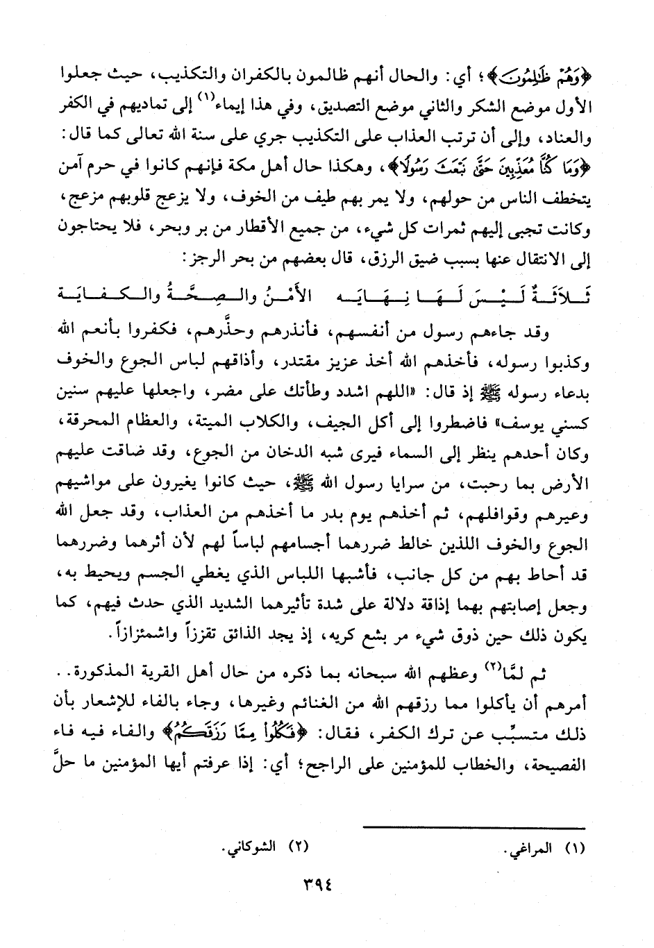 وقد جاءهم رسول من أنفسهم، فأنذرهم وحذَّرهم، فكفروا بأنعم الله وكذبوا رسوله، فأخذهم الله أخذ عزيز مقتدر، وأذاقهم لباس الجوع والخوف بدعاء رسول - صلى الله عليه وسلم - إذ قال: "اللهم اشدد وطأتك على مضر، واجعلها عليهم سنين كسني يوسف" فاضطروا إلى أكل الجيف، والكلاب الميتة، والعظام المحرقة، وكان أحدهم ينظر إلى السماء فيرى شبه الدخان من الجوع، وقد ضاقت عليهم الأرض بما رحبت، من سرايا رسول الله - صلى الله عليه وسلم -، حيث كانوا يغيرون على مواشيهم وعيرهم وقوافلهم، ثم أخذهم يوم بدر ما أخذهم من العذاب، وقد جعل الله الجوع والخوف اللذين خالط ضررهما أجسامهم لباسًا لهم لأن أثرهما وضررهما قد أحاط بهم من كل جانب، فأشبها اللباس الذي يغطي الجسم ويحيط به، وجعل إصابتهم بهما إذاقة دلالة على شدة تأثيرهما الشديد الذي حدث فيهم، كما يكون ذلك حين ذوق شيء مر بشع كريه، إذ يجد الذائق تقززًا واشمئزازًا.