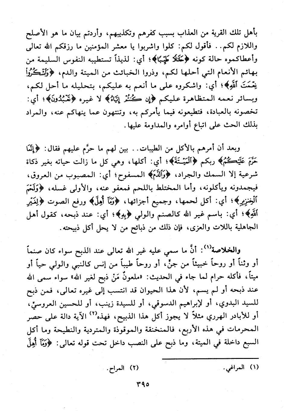 والخلاصة (¬1): أنَّ ما سمي عليه غير الله تعالى عند الذبح سواء كان صنمًا أو وثنًا أو روحًا خبيثًا من جنٍّ، أو روحًا طيبًا من إنس كالنبي والولي حيًّا أو ميتًا، فأكله حرام لما جاء في الحديث: "ملعونٌ مَنْ ذبح لغير الله" سواء سمى الله عند ذبحه أو لم يسم؛ لأن هذا الحيوان قد انتسب إلى غيره تعالى، فمن ذبح للسيد البدوي، أو لإبراهيم الدسوقي، أو للسيدة زينب، أو للحسين العروسيِّ، أو للأبادر الهرري مثلًا لا يجوز أكل هذا الذبيح، فهذه (¬2) الآية دالة على حصر المحرمات في هذه الأربع، فالمنخنقة والموقوذة والمتردية والنطيحة وما أكل السبع داخلة في الميتة، وما ذبح على النصب داخل تحت قوله تعالى: {وَمَا أُهِلَّ