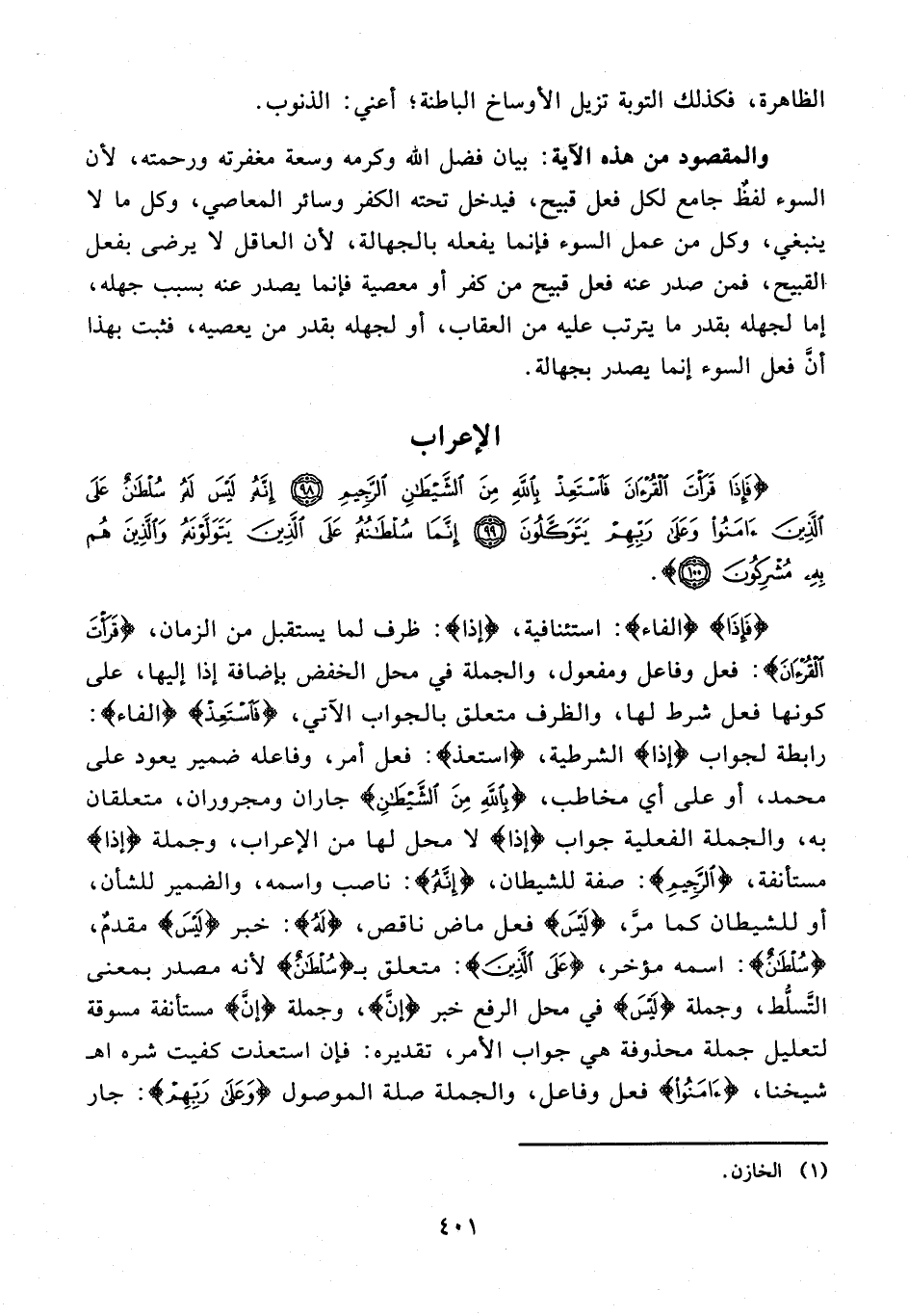 {فَإِذَا} {الفاء}: استئنافية، {إذا}: ظرف لما يستقبل من الزمان، {قَرَأْتَ الْقُرْآنَ}: فعل وفاعل ومفعول، والجملة في محل الخفض بإضافة إذا إليها، على كونها فعل شرط لها، والظرف متعلق بالجواب الآتي، {فَاسْتَعِذْ} {الفاء}: رابطة لجواب {إذا} الشرطية، {استعذ}: فعل أمر، وفاعله ضمير يعود على محمَّد، أو على أي مخاطب، {بِاللَّهِ مِنَ الشَّيْطَانِ} جاران ومجروران، متعلقان به، والجملة الفعلية جواب {إذا} لا محل لها من الإعراب، وجملة {إذا} مستأنفة، {الرَّجِيمِ}: صفة للشيطان، {إِنَّهُ}: ناصب واسمه، والضمير للشأن، أو للشيطان كما مرَّ، {لَيْسَ} فعل ماض ناقص، {لَهُ}: خبر {لَيْسَ} مقدمٌ، {سُلْطَانٌ}: اسمه مؤخر، {عَلَى الَّذِينَ}: متعلق بـ {سُلْطَانٌ} لأنه مصدر بمعنى التَّسلُّط، وجملة {لَيْسَ} في محل الرفع خبر {إِنّ}، وجملة {إِنّ} مستأنفة مسوقة لتعليل جملة محذوفة هي جواب الأمر، تقديره: فإن استعذت كفيت شره اهـ شيخنا، {آمَنُوا} فعل وفاعل، والجملة صلة الموصول {وَعَلَى رَبِّهِمْ}: جار