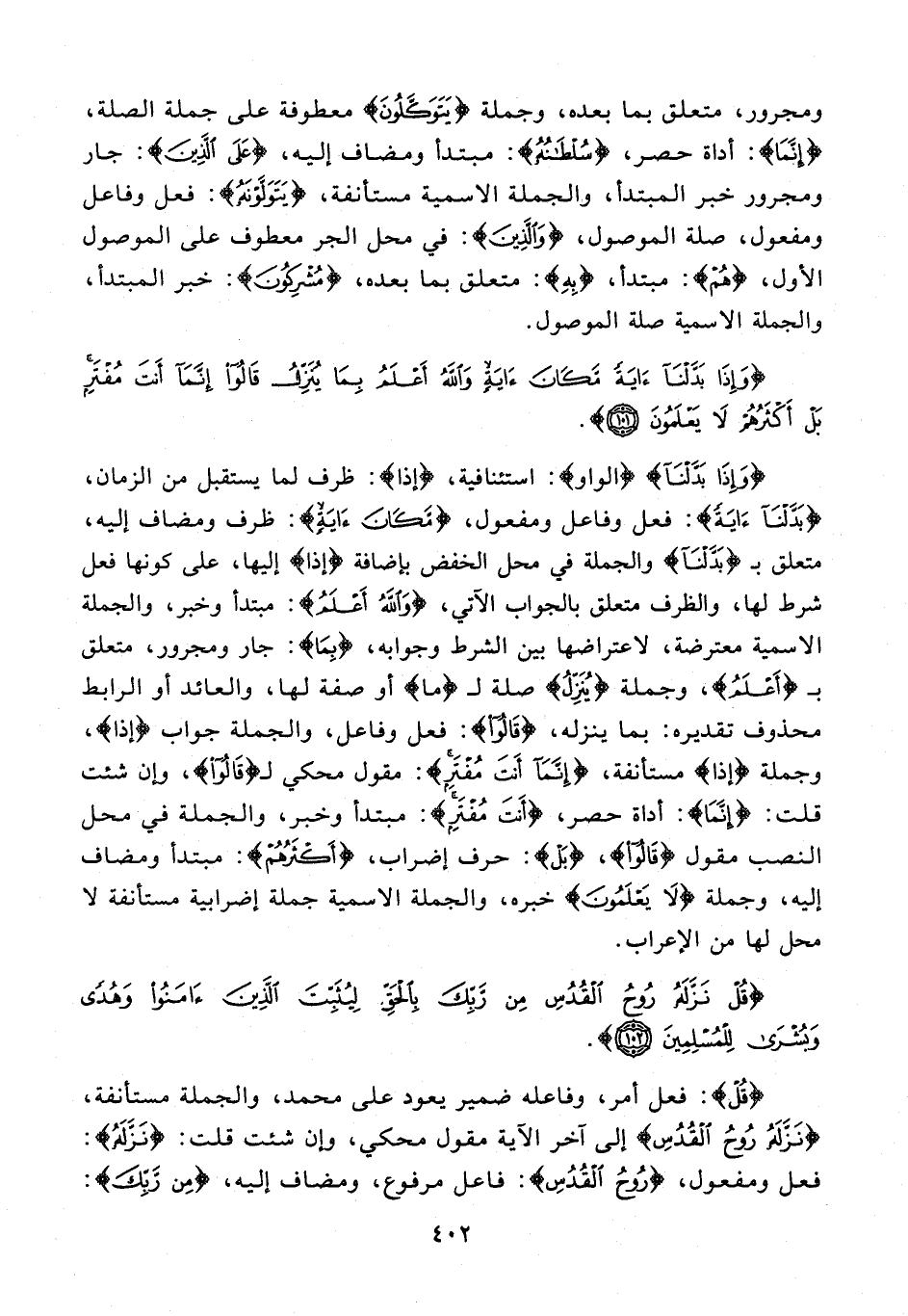{قُلْ}: فعل أمر، وفاعله ضمير يعود على محمَّد، والجملة مستأنفة، {نَزَّلَهُ رُوحُ الْقُدُسِ} إلى آخر الآية مقول محكي، وإن شئت قلت: {نَزَّلَهُ}: فعل ومفعول، {رُوحُ الْقُدُسِ}: فاعل مرفوع، ومضاف إليه، {مِنْ رَبِّكَ}: