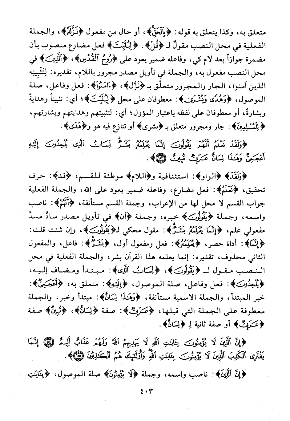 متعلق به، وكذا يتعلق به قوله: {بِالْحَقِّ}، أو حال من مفعول {نَزَّلَهُ}، والجملة الفعلية في محل النصب مقولٌ لـ {قُلْ}. {لِيُثَبِّتَ} فعل مضارع منصوب بأن مضمرة جوازًا بعد لام كي، وفاعله ضمير يعود على {رُوحُ الْقُدُسِ}، {الَّذِينَ} في محل النصب مفعول به، والجملة في تأويل مصدر مجرور باللام، تقديره: لِتَثْبِيتِه الذين آمنوا، الجار والمجرور متعلّق بـ {نَزَّلَ}، {آمَنُوا}: فعل وفاعل، صلة الموصول، {وَهُدًى وَبُشْرَى}: معطوفان على محل {لِيُثَبِّتَ}؛ أي: تثبيتًا وهدايةً وبشارةً، أو معطوفان على لفظه باعتبار المؤول؛ أي: لتثبيتهم وهدايتهم وبشارتهم، {لِلْمُسْلِمِينَ}: جار ومجرور متعلق بـ {بشرى} أو تنازع فيه هو و {هُدًى}.