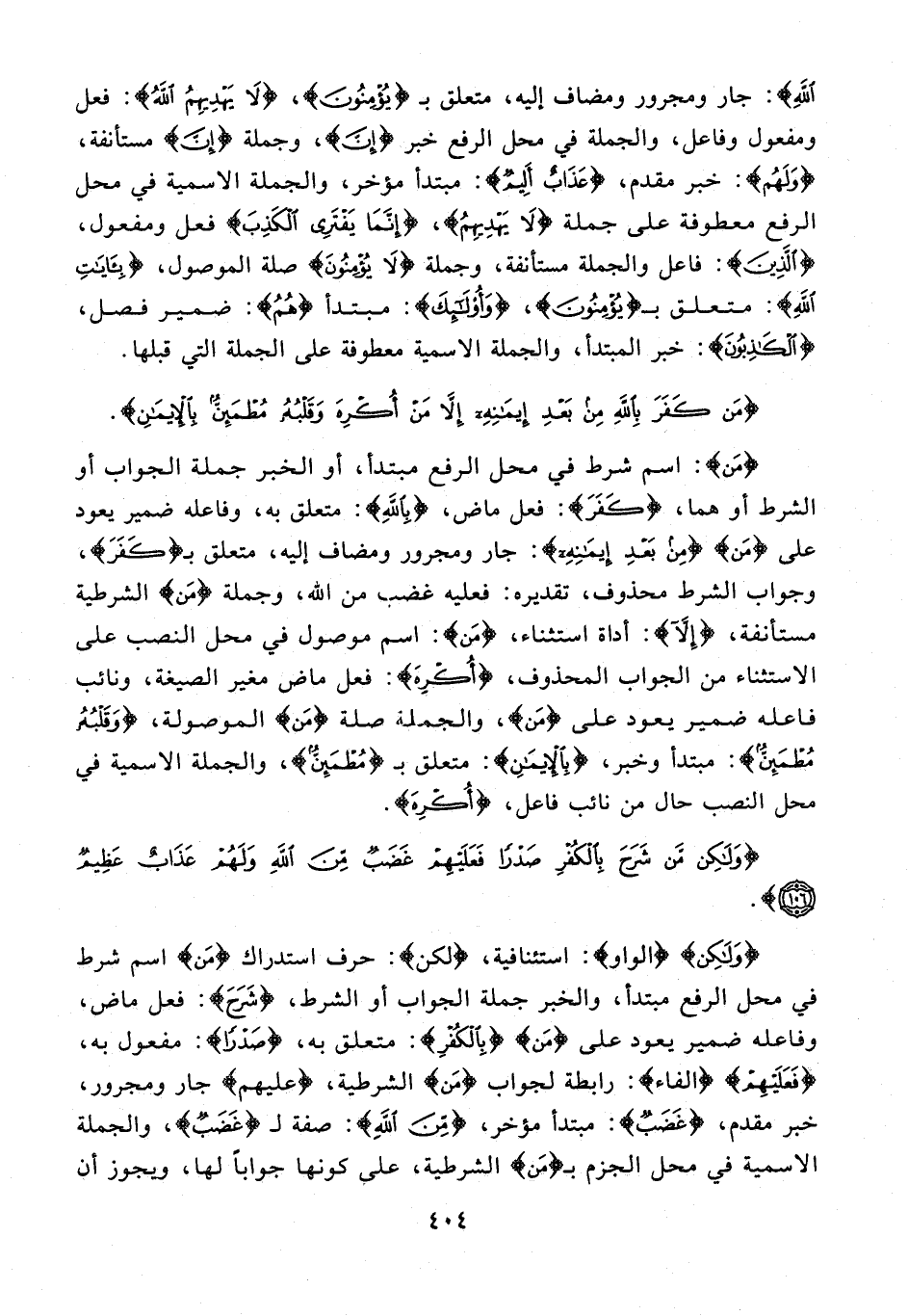 {مَنْ}: اسم شرط في محل الرفع مبتدأ، أو الخبر جملة الجواب أو الشرط أو هما، {كَفَرَ}: فعل ماض، {بِاللَّهِ}: متعلق به، وفاعله ضمير يعود على {مَنْ} {مِنْ بَعْدِ إِيمَانِهِ}: جار ومجرور ومضاف إليه، متعلق بـ {كَفَرَ}، وجواب الشرط محذوف، تقديره: فعليه غضب من الله، وجملة {مَنْ} الشرطية مستأنفة، {إِلَّا}: أداة استثناء، {مَنْ}: اسم موصول في محل النصب على الاستثناء من الجواب المحذوف، {أُكْرِهَ}: فعل ماض مغير الصيغة، ونائب فاعله ضمير يعود على {مَنْ}، والجملة صلة {مَنْ} الموصولة، {وَقَلْبُهُ مُطْمَئِنٌّ}: مبتدأ وخبر، {بِالْإِيمَانِ}: متعلق بـ {مُطْمَئِنٌّ}، والجملة الاسمية في محل النصب حال من نائب فاعل، {أُكْرِهَ}.