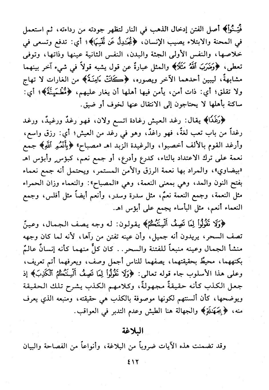 فُتِنُوا} أصل الفتن إدخال الذهب في النار لتظهر جودته من رداءته، ثم استعمل في المحنة والابتلاء يصيب الإنسان، {تُجَادِلُ عَنْ نَفْسِهَا}؛ أي: تدفع وتسعى في خلاصها، والنفس الأولى الجثة والبدن، النفس الثانية عينها وذاتها، وتوفى تعطى، {وَضَرَبَ اللَّهُ مَثَلًا} والمثل عبارةٌ عن قول يشبه قولًا في شيء آخر بينهما مشابهةٌ، ليبين أحدهما الآخر ويصوره، {كَانَتْ آمِنَةً} من الغارات لا تهاج ولا تقلق؛ أي: ذات أمن، يأمن فيها أهلها أن يغار عليهم، {مُطْمَئِنَّةً}؛ أي: ساكنة بأهلها لا يحتاجون إلى الانتقال عنها لخوف أو ضيق.