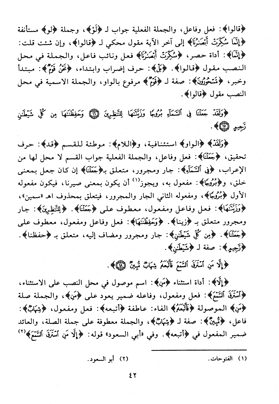 {وَلَقَدْ} {الواو} استئنافية، و {اللام}: موطئة للقسم {قد}: حرف تحقيق، {جَعَلْنَا}: فعل وفاعل، والجملة الفعلية جواب القسم لا محل لها من الإعراب، {فِي السَّمَاءِ}: جار ومجرور، متعلق بـ {جَعَلْنَا} إن كان جعل بمعنى خلق، و {بُرُوجًا}: مفعول به، ويجوز (¬1) أن يكون بمعنى صيرنا، فيكون مفعوله الأول {بُرُوجًا}، ومفعوله الثاني الجار والمجرور، فيتعلق بمحذوف اهـ "سمين"، {وَزَيَّنَّاهَا}: فعل وفاعل ومفعول، معطوف على {جَعَلْنَا}. {لِلنَّاظِرِينَ}: جار ومجرور متعلق بـ {زينا}. {وَحَفِظْنَاهَا}: فعل وفاعل ومفعول، معطوف على {جَعَلْنَا}. {مِنْ كُلِّ شَيْطَانٍ}: جار ومجرور ومضاف إليه، متعلق بـ {حفظنا}. {رَجِيمٍ}: صفة لـ {شَيْطَانٍ}.