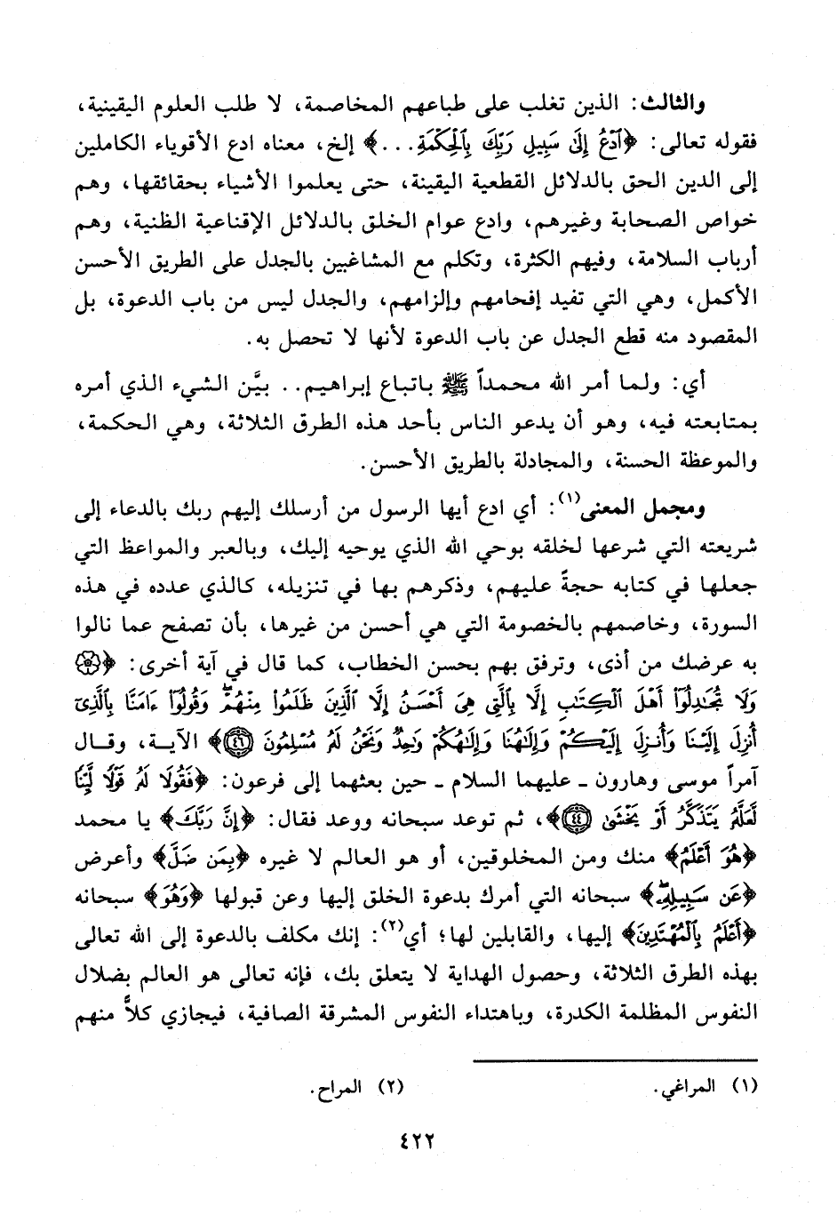 والثالث: الذين تغلب على طباعهم المخاصمة، لا طلب العلوم اليقينية، فقوله تعالى: {ادْعُ إِلَى سَبِيلِ رَبِّكَ بِالْحِكْمَةِ ...} إلخ، معناه ادع الأقوياء الكاملين إلى الدين الحق بالدلائل القطعية اليقينة، حتى يعلموا الأشياء بحقائقها، وهم خواص الصحابة وغيرهم، وادع عوام الخلق بالدلائل الإقناعية الظنية، وهم أرباب السلامة، وفيهم الكثرة، وتكلم مع المشاغبين بالجدل على الطريق الأحسن الأكمل، وهي التي تفيد إفحامهم وإلزامهم، والجدل ليس من باب الدعوة، بل المقصود منه قطع الجدل عن باب الدعوة لأنها لا تحصل به.