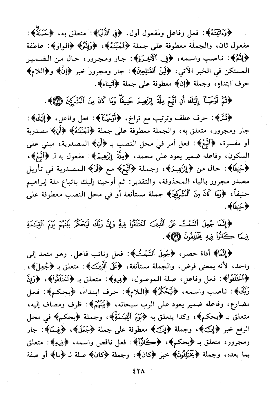 {ثُمَّ}: حرف عطف وترتيب مع تراخ، {أَوْحَيْنَا}: فعل وفاعل، {إِلَيْكَ}: جار ومجرور، متعلق به، والجملة معطوفة على جملة {اجْتَبَاهُ} {أَنِ} مصدرية أو مفسرة، {اتَّبِعْ}: فعل أمر في محل النصب بـ {أَنِ} المصدرية، مبني على السكون، وفاعله ضمير يعود على محمَّد، {مِلَّةَ إِبْرَاهِيمَ}: مفعول به لـ {اتَّبِعْ}، {حَنِيفًا}: حال من {إِبْرَاهِيمَ}، وجملة {اتَّبِعْ} مع {أَنِ} المصدرية في تأويل مصدر مجرور بالباء المحذوفة، والتقدير: ثم أوحينا إليك باتباع ملة إبراهيم حنيفًا، {وَمَا كَانَ مِنَ الْمُشْرِكِينَ} جملة مستأنفة أو في محل النصب معطوفة على {حَنِيفًا}.