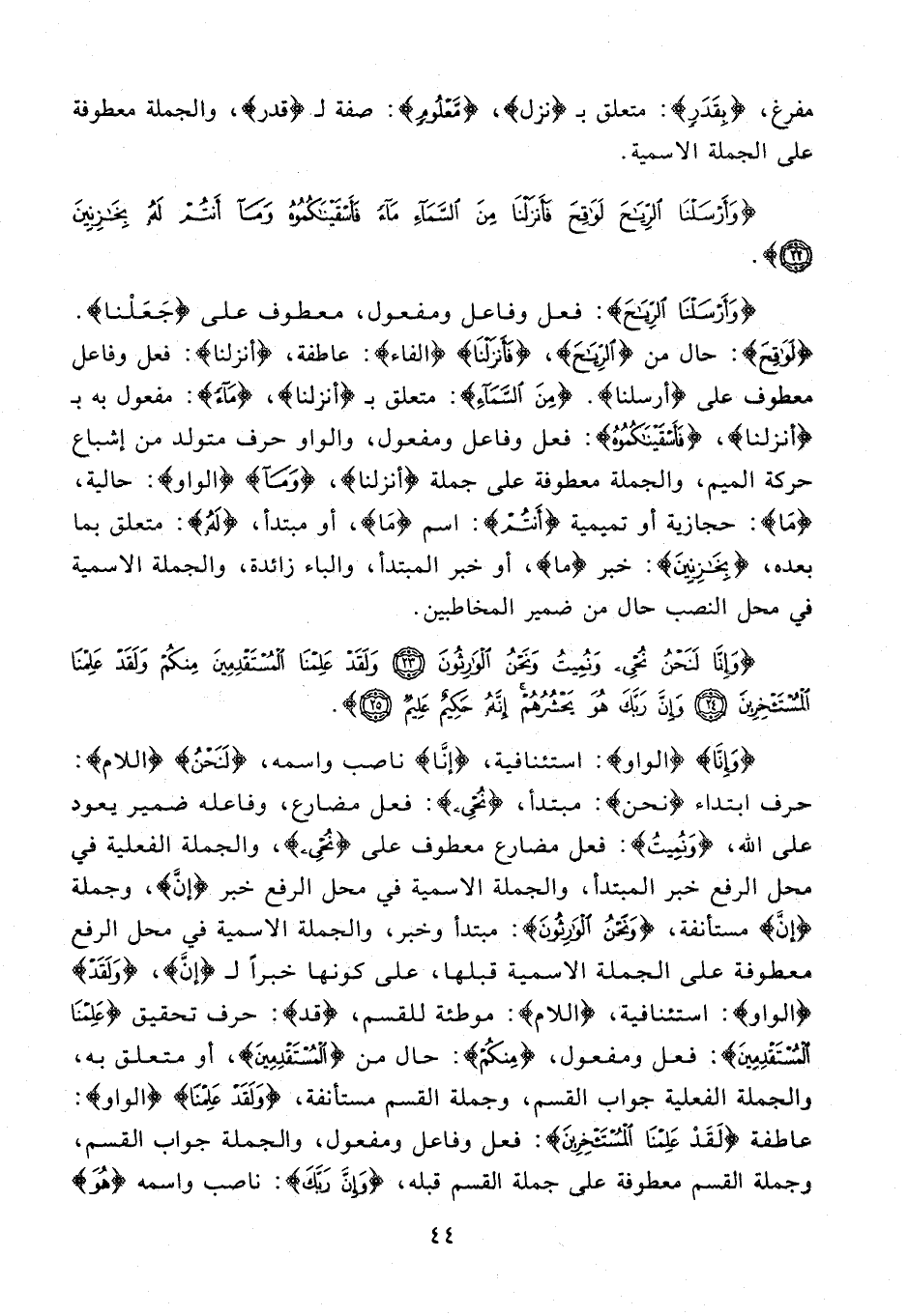 {وَأَرْسَلْنَا الرِّيَاحَ}: فعل وفاعل ومفعول، معطوف على {جَعَلْنا}. {لَوَاقِحَ}: حال من {الرِّيَاحَ}، {فَأَنْزَلْنَا} {الفاء}: عاطفة، {أنزلنا}: فعل وفاعل معطوف على {أرسلنا}. {مِنَ السَّمَاءِ}: متعلق بـ {أنزلنا}، {مَا}: مفعول به بـ {أنزلنا}، {فَأَسْقَيْنَاكُمُوهُ}: فعل وفاعل ومفعول، والواو حرف متولد من إشباع حركة الميم، والجملة معطوفة على جملة {أنزلنا}، {وَمَا} {الواو}: حالية، {مَا}: حجازية أو تميمية {أَنْتُمْ}: اسم {مَا}، أو مبتدأ، {لَهُ}: متعلق بما بعده، {بِخَازِنِينَ}: خبر {ما}، أو خبر المبتدأ، والباء زائدة، والجملة الاسمية في محل النصب حال من ضمير المخاطبين.