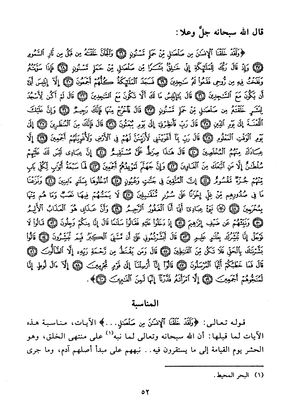 {وَلَقَدْ خَلَقْنَا الْإِنْسَانَ مِنْ صَلْصَالٍ مِنْ حَمَإٍ مَسْنُونٍ (26) وَالْجَانَّ خَلَقْنَاهُ مِنْ قَبْلُ مِنْ نَارِ السَّمُومِ (27) وَإِذْ قَالَ رَبُّكَ لِلْمَلَائِكَةِ إِنِّي خَالِقٌ بَشَرًا مِنْ صَلْصَالٍ مِنْ حَمَإٍ مَسْنُونٍ (28) فَإِذَا سَوَّيْتُهُ وَنَفَخْتُ فِيهِ مِنْ رُوحِي فَقَعُوا لَهُ سَاجِدِينَ (29) فَسَجَدَ الْمَلَائِكَةُ كُلُّهُمْ أَجْمَعُونَ (30) إِلَّا إِبْلِيسَ أَبَى أَنْ يَكُونَ مَعَ السَّاجِدِينَ (31) قَالَ يَا إِبْلِيسُ مَا لَكَ أَلَّا تَكُونَ مَعَ السَّاجِدِينَ (32) قَالَ لَمْ أَكُنْ لِأَسْجُدَ لِبَشَرٍ خَلَقْتَهُ مِنْ صَلْصَالٍ مِنْ حَمَإٍ مَسْنُونٍ (33) قَالَ فَاخْرُجْ مِنْهَا فَإِنَّكَ رَجِيمٌ (34) وَإِنَّ عَلَيْكَ اللَّعْنَةَ إِلَى يَوْمِ الدِّينِ (35) قَالَ رَبِّ فَأَنْظِرْنِي إِلَى يَوْمِ يُبْعَثُونَ (36) قَالَ فَإِنَّكَ مِنَ الْمُنْظَرِينَ (37) إِلَى يَوْمِ الْوَقْتِ الْمَعْلُومِ (38) قَالَ رَبِّ بِمَا أَغْوَيْتَنِي لَأُزَيِّنَنَّ لَهُمْ فِي الْأَرْضِ وَلَأُغْوِيَنَّهُمْ أَجْمَعِينَ (39) إِلَّا عِبَادَكَ مِنْهُمُ الْمُخْلَصِينَ (40) قَالَ هَذَا صِرَاطٌ عَلَيَّ مُسْتَقِيمٌ (41) إِنَّ عِبَادِي لَيْسَ لَكَ عَلَيْهِمْ سُلْطَانٌ إِلَّا مَنِ اتَّبَعَكَ مِنَ الْغَاوِينَ (42) وَإِنَّ جَهَنَّمَ لَمَوْعِدُهُمْ أَجْمَعِينَ (43) لَهَا سَبْعَةُ أَبْوَابٍ لِكُلِّ بَابٍ مِنْهُمْ جُزْءٌ مَقْسُومٌ (44) إِنَّ الْمُتَّقِينَ فِي جَنَّاتٍ وَعُيُونٍ (45) ادْخُلُوهَا بِسَلَامٍ آمِنِينَ (46) وَنَزَعْنَا مَا فِي صُدُورِهِمْ مِنْ غِلٍّ إِخْوَانًا عَلَى سُرُرٍ مُتَقَابِلِينَ (47) لَا يَمَسُّهُمْ فِيهَا نَصَبٌ وَمَا هُمْ مِنْهَا بِمُخْرَجِينَ (48) نَبِّئْ عِبَادِي أَنِّي أَنَا الْغَفُورُ الرَّحِيمُ (49) وَأَنَّ عَذَابِي هُوَ الْعَذَابُ الْأَلِيمُ (50) وَنَبِّئْهُمْ عَنْ ضَيْفِ إِبْرَاهِيمَ (51) إِذْ دَخَلُوا عَلَيْهِ فَقَالُوا سَلَامًا قَالَ إِنَّا مِنْكُمْ وَجِلُونَ (52) قَالُوا لَا تَوْجَلْ إِنَّا نُبَشِّرُكَ بِغُلَامٍ عَلِيمٍ (53) قَالَ أَبَشَّرْتُمُونِي عَلَى أَنْ مَسَّنِيَ الْكِبَرُ فَبِمَ تُبَشِّرُونَ (54) قَالُوا بَشَّرْنَاكَ بِالْحَقِّ فَلَا تَكُنْ مِنَ الْقَانِطِينَ (55) قَالَ وَمَنْ يَقْنَطُ مِنْ رَحْمَةِ رَبِّهِ إِلَّا الضَّالُّونَ (56) قَالَ فَمَا خَطْبُكُمْ أَيُّهَا الْمُرْسَلُونَ (57) قَالُوا إِنَّا أُرْسِلْنَا إِلَى قَوْمٍ مُجْرِمِينَ (58) إِلَّا آلَ لُوطٍ إِنَّا لَمُنَجُّوهُمْ أَجْمَعِينَ (59) إِلَّا امْرَأَتَهُ قَدَّرْنَا إِنَّهَا لَمِنَ الْغَابِرِينَ (60)}.