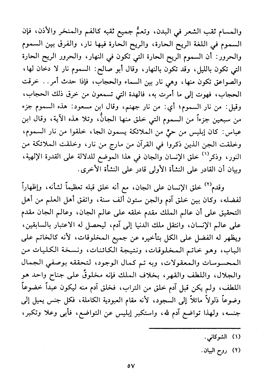 والمسام ثقب الشعر في البدن، وتعمُّ جميع ثقبه كالفم والمنخر والأذن، فإن السموم في اللغة الريح الحارة، والريح الحارة فيها نار، والفرق بين السموم والحرور: أن السموم الريح الحارة التي تكون في النهار، والحرور الريح الحارة التي تكون بالليل، وقد تكون بالنهار، وقال أبو صالح: السموم نار لا دخان لها، والصواعق تكون منها، وهي نار بين السماء والحجاب، فإذا حدث أمر .. خرقت الحجاب، فهوت إلى ما أمرت به، فالهدة التي تسمعون من خرق ذلك الحجاب، وقيل: من نار السموم؛ أي: من نار جهنم، وقال ابن مسعود: هذه السموم جزء من سبعين جزءًا من السموم التي خلق منها الجانُّ، وتلا هذه الآية، وقال ابن عباس: كان إبليس من حيٍّ من الملائكة يسمون الجان، خلقوا من نار السموم، وخلقت الجن الذين ذكروا في القرآن من مارج من نار، وخلقت الملائكة من النور، وذكر (¬1) خلق الإنسان والجان في هذا الموضع للدلالة على القدرة الإلهية، وبيان أن القادر على النشاة الأولى قادر على النشأة الأخرى.