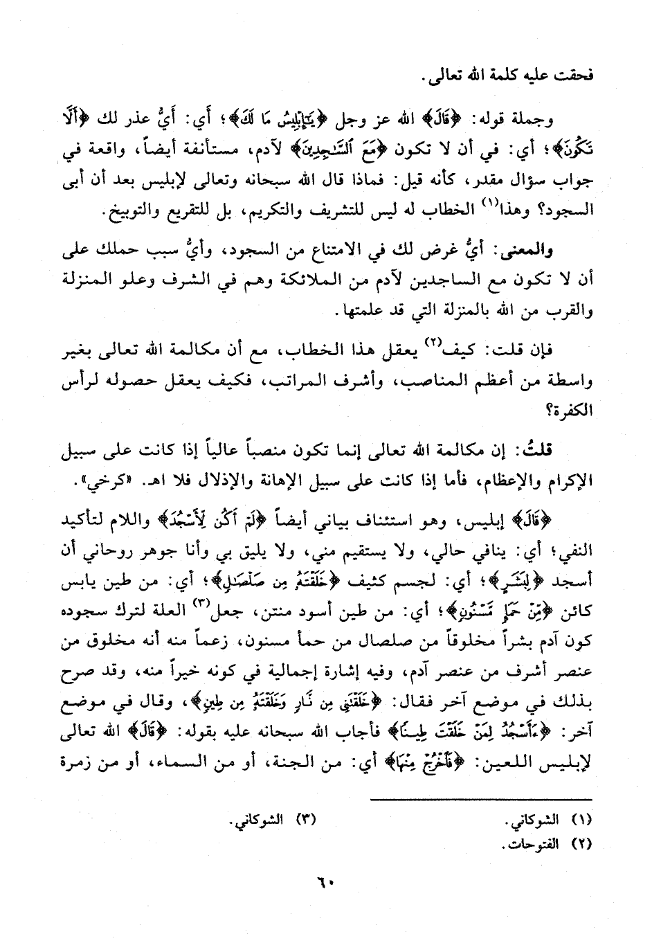 32 - وجملة قوله: {قَالَ} الله عَزَّ وَجَلَّ {يَا إِبْلِيسُ مَا لَكَ}؛ أي: أَيُّ عذر لك {أَلَّا تَكُونَ}؛ أي: في أن لا تكون {مَعَ السَّاجِدِينَ} لآدم، مستأنفة أيضًا، واقعة في جواب سؤال مقدر، كأنه قيل: فماذا قال الله سبحانه وتعالى لإبليس بعد أن أبى السجود؟ وهذا (¬1) الخطاب له ليس للتشريف والتكريم، بل للتقريع والتوبيخ.