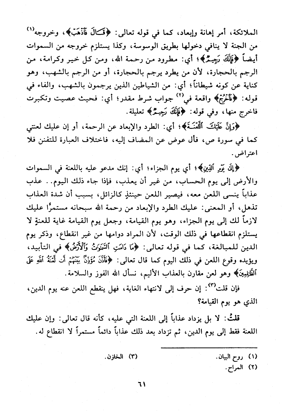 35 - {وَإِنَّ عَلَيْكَ اللَّعْنَةَ}؛ أي: الطرد والإبعاد عن الرحمة، أو إن عليك لعنتي كما في سورة ص، فأل عوض عن المضاف إليه، فاختلاف العبارة للتفنن فلا اعتراض.