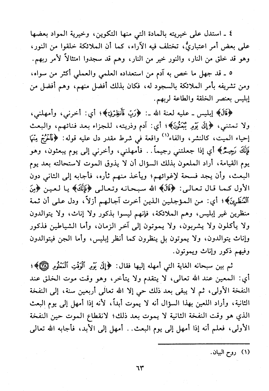 4 - استدل على خيريته بالمادة التي منها التكوين، وخيرية المواد بعضها على بعض أمر اعتباريُّ، تختلف فيه الآراء، كما أن الملائكة خلقوا من النور، وهو قد خلق من النار، والنور خير من النار، وهم قد سجدوا امتثالًا لأمر ربهم.