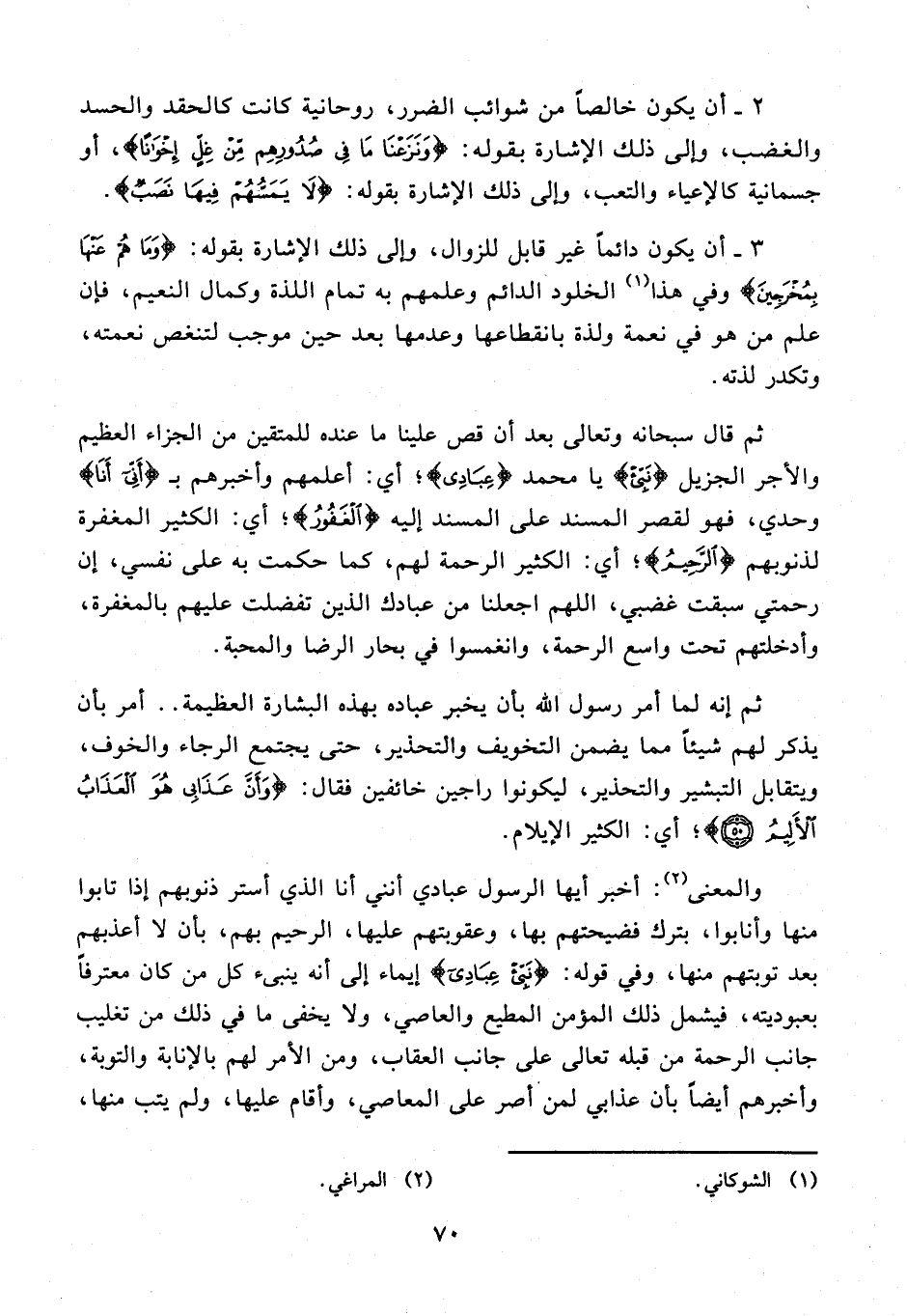49 - ثم قال سبحانه وتعالى بعد أن قص علينا ما عنده للمتقين من الجزاء العظيم والأجر الجزيل {نَبِّئْ} يا محمد {عِبَادِي}؛ أي: أعلمهم وأخبرهم بـ {أَنِّي أَنَا} وحدي، فهو لقصر المسند على المسند إليه {الْغَفُورُ}؛ أي: الكثير المغفرة لذنوبهم {الرَّحِيمُ}؛ أي: الكثير الرحمة لهم، كما حكمت به على نفسي، إن رحمتي سبقت غضبي، اللهم اجعلنا من عبادك الذين تفضلت عليهم بالمغفرة، وأدخلتهم تحت واسع الرحمة، وانغمسوا في بحار الرضا والمحبة.