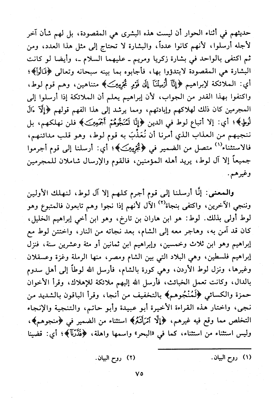 والمعنى: إنَّا أرسلنا إلى قوم أجرم كلهم إلا آل لوط، لنهلك الأولين وننجي الآخرين، واكتفى بنجاة (¬2) الآل لأنهم إذا نجوا وهم تابعون فالمتبوع وهو لوط أولى بذلك. لوط: هو ابن هاران بن تارخ، وهو ابن أخي إبراهيم الخليل، كان قد آمن به، وهاجر معه إلى الشام، بعد نجاته من النار، واختتن لوط مع إبراهيم وهو ابن ثلاث وخمسين، وإبراهيم ابن ثمانين أو مدّة وعشرين سنة، فنزل إبراهيم فلسطين، وهي البلاد التي بين الشام ومصر، منها الرملة وغزة وعسقلان وغيرها، ونزل لوط الأردن، وهي كورة بالشام، فأرسل الله لوطًا إلى أهل سدوم بالدال، وكانت تعمل الخبائث، فأرسل الله إليهم ملائكة للإهلاك، وقرأ الأخوان حمزة والكسائي {لَمُنَجُّوهُمْ} بالتخفيف من أنجا، وقرأ الباقون بالتشديد من نجى، واختار هذه القراءة الأخيرة أبو عبيدة وأبو حاتم، والتنجية والإنجاء التخلص مما وقع فيه غيرهم،
