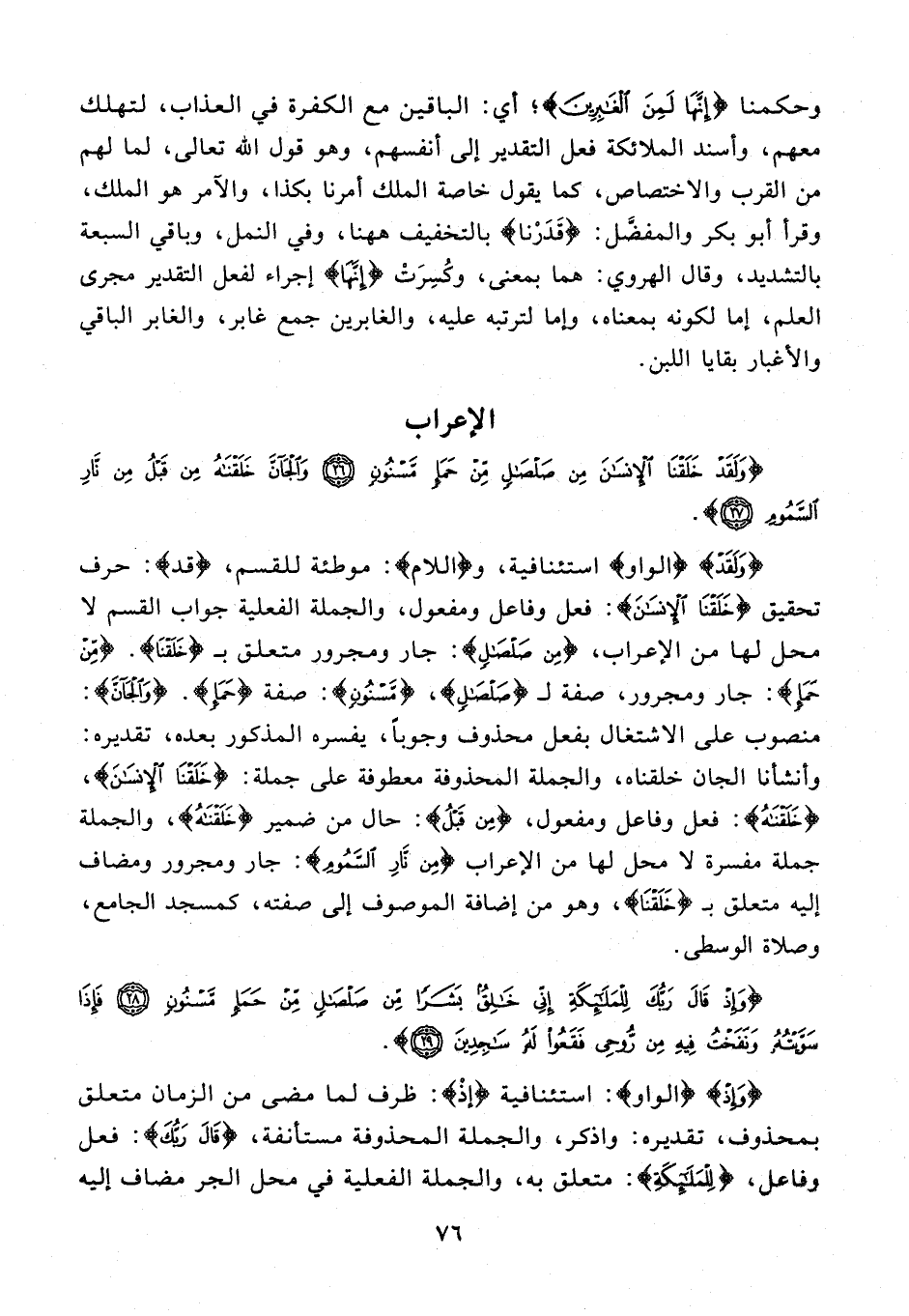 {وَلَقَدْ} (الواو) استئنافية، و {اللام}: موطئة للقسم، {قد}: حرف تحقيق {خَلَقْنَا الْإِنْسَانَ}: فعل وفاعل ومفعول، والجملة الفعلية جواب القسم لا محل لها من الإعراب، {مِنْ صَلْصَالٍ}: جار ومجرور متعلق بـ {خَلَقْنَا}. {مِنْ حَمَإٍ}: جار ومجرور، صفة لـ {صَلْصَالٍ}، {مَسْنُونٍ}: صفة {حَمَإٍ}. {وَالْجَانَّ}: منصوب على الاشتغال بفعل محذوف وجوبًا، يفسره المذكور بعده، تقديره: وأنشأنا الجان خلقناه، والجملة المحذوفة معطوفة على جملة: {خَلَقْنَا الْإِنْسَانَ}، {خَلَقْنَاهُ}: فعل وفاعل ومفعول، {مِنْ قَبْلُ}: حال من ضمير {خَلَقْنَاهُ}، والجملة جملة مفسرة لا محل لها من الإعراب {مِنْ نَارِ السَّمُومِ}: جار ومجرور ومضاف إليه متعلق بـ {خَلَقْنَا}، وهو من إضافة الموصوف إلى صفته، كمسجد الجامع، وصلاة الوسطى.