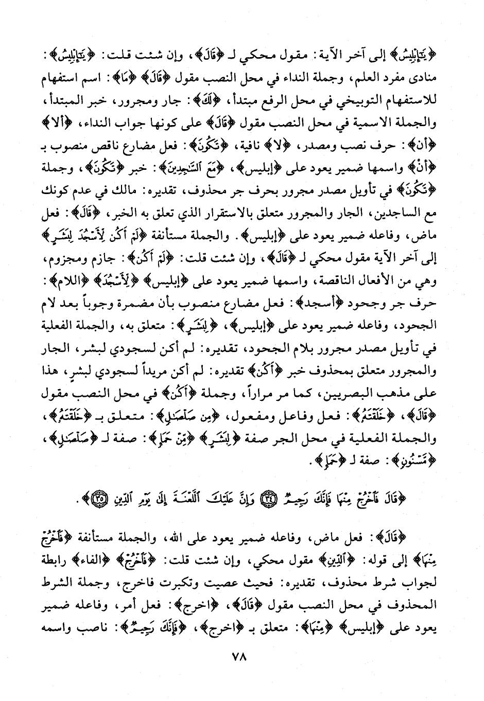 {يَا إِبْلِيسُ} إلى آخر الآية: مقول محكي لـ {قَالَ}، وإن شئت قلت: {يَا إِبْلِيسُ}: منادى مفرد العلم، وجملة النداء في محل النصب مقول {قَالَ} {مَا}: اسم استفهام للاستفهام التوبيخي في محل الرفع مبتدأ، {لَكَ}: جار ومجرور، خبر المبتدأ، والجملة الاسمية في محل النصب مقول {قَالَ} على كونها جواب النداء، {أَلَّا} {أن}: حرف نصب ومصدر، {لا} نافية، {تَكُونَ}: فعل مضارع ناقص منصوب بـ {أنْ} واسمها ضمير يعود على {إبليس}، {مَعَ السَّاجِدِينَ}: خبر {تَكُونَ}، وجملة {تَكُونَ} في تأويل مصدر مجرور بحرف جر محذوف، تقديره: ما لك في عدم كونك مع الساجدين، الجار والمجرور متعلق بالاستقرار الذي تعلق به الخبر، {قَالَ}: فعل ماض، وفاعله ضمير يعود على {إبليس}. والجملة مستأنفة {لَمْ أَكُنْ لِأَسْجُدَ لِبَشَرٍ} إلى آخر الآية مقول محكي لـ {قَالَ}، وإن شئت قلت: {لَمْ أَكُنْ}: جازم ومجزوم، وهي من الأفعال الناقصة، واسمها ضمير يعود على {إبليس} {لِأَسْجُدَ} {اللام}: حرف جر وجحود {أسجد}: فعل مضارع منصوب بأن مضمرة وجوبًا بعد لام الجحود، وفاعله ضمير يعود على {إبليس}، {لِبَشَر}: متعلق به، والجملة الفعلية في تأويل مصدر مجرور بلام الجحود، تقديره: لم أكن لسجودي لبشر، الجار والمجرور متعلق بمحذوف خبر {أَكُن} تقديره: لم أكن مريدًا لسجودي لبشرٍ، هذا على مذهب البصريين، كما مر مرارًا، وجملة {أَكُن} في محل النصب مقول {قَالَ}، {خَلَقْتَهُ}: فعل وفاعل ومفعول، {مِنْ صَلْصَالٍ}: متعلق بـ {خَلَقْتَهُ}، والجملة الفعلية في محل الجر صفة {لِبَشَرٍ} {مِنْ حَمَإٍ}: صفة لـ {صَلْصَالٍ}، {مَسْنُونٍ}: صفة لـ {حَمَإٍ}.