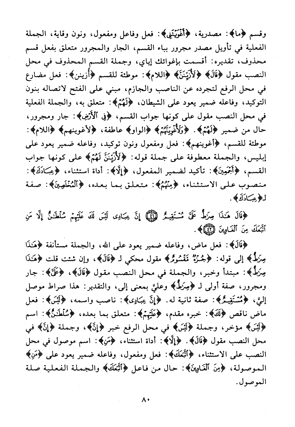 وقسم {ما}: مصدرية، {أَغْوَيْتَنِي}: فعل وفاعل ومفعول، ونون وقاية، الجملة الفعلية في تأويل مصدر مجرور بباء القسم، الجار والمجرور متعلق بفعل قسم محذوف، تقديره: أقسمت بإغوائك إياي، وجملة القسم المحذوف في محل النصب مقول {قَالَ} {لَأُزَيِّنَنَّ} {اللام}: موطئة للقسم {أُزينن}: فعل مضارع في محل الرفع لتجرده عن الناصب والجازم، مبني على الفتح لاتصاله بنون التوكيد، وفاعله ضمير يعود على الشيطان، {لَهُمْ}: متعلق به، والجملة الفعلية في محل النصب مقول على كونها جواب القسم، {فِي الْأَرْضِ}: جار ومجرور، حال من ضمير {لَهُمْ}. {وَلَأُغْوِيَنَّهُمْ} {الواو} عاطفة، {لَأُغْوِيَنَّهُمْ} {اللام}: موطئة للقسم، {أغوينهم}: فعل ومفعول ونون توكيد، وفاعله ضمير يعود على إبليس، والجملة معطوفة على جملة قوله: {لَأُزَيِّنَنَّ لَهُمْ} على كونها جواب القسم، {أَجْمَعِينَ}: تأكيد لضمير المفعول، {إِلَّا}: أداة استثناء، {عِبَادَكَ}: منصوب على الاستثناء، {مِنْهُمُ}: متعلق بما بعده، {الْمُخْلَصِينَ}: صفة لـ {عِبَادَكَ}.