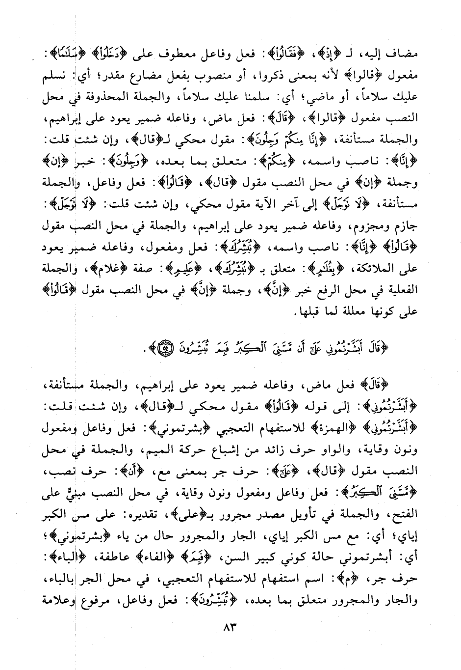 مضاف إليه، لـ {إِذْ}، {فَقَالُوا}: فعل وفاعل معطوف على {دَخَلُوا} {سَلَامًا}: مفعول {قالوا} لأنه بمعنى ذكروا، أو منصوب بفعل مضارع مقدر؛ أي: نسلم عليك سلامًا، أو ماضي؛ أي: سلمنا عليك سلامًا، والجملة المحذوفة في محل النصب مفعول {قالوا}، {قَالَ}: فعل ماض، وفاعله ضمير يعود على إبراهيم، والجملة مستأنفة، {إِنَّا مِنْكُمْ وَجِلُونَ}: مقول محكي لـ {قَالَ}، وإن شئت قلت: {إِنَّا}: ناصب واسمه، {مِنْكُمْ}: متعلق بما بعده، {وَجِلُونَ}: خبر {إن} وجملة {إن} في محل النصب مقول {قال}، {قَالُوا}: فعل وفاعل، والجملة مستأنفة، {لَا تَوْجَلْ} إلى آخر الآية مقول محكي، وإن شئت قلت: {لَا تَوْجَلْ}: جازم ومجزوم، وفاعله ضمير يعود على إبراهيم، والجملة في محل النصب مقول {قَالُوا} {إِنَّا}: ناصب واسمه، {نُبَشِّرُكَ}: فعل ومفعول، وفاعله ضمير يعود على الملائكة، {بِغُلَامٍ}: متعلق بـ {نُبَشِّرُكَ}، {عَلِيمٍ}: صفة {غلام}، والجملة الفعلية في محل الرفع خبر {إنَّ}، وجملة {إنَّ} في محل النصب مقول {قَالُوا} على كونها معللة لما قبلها.