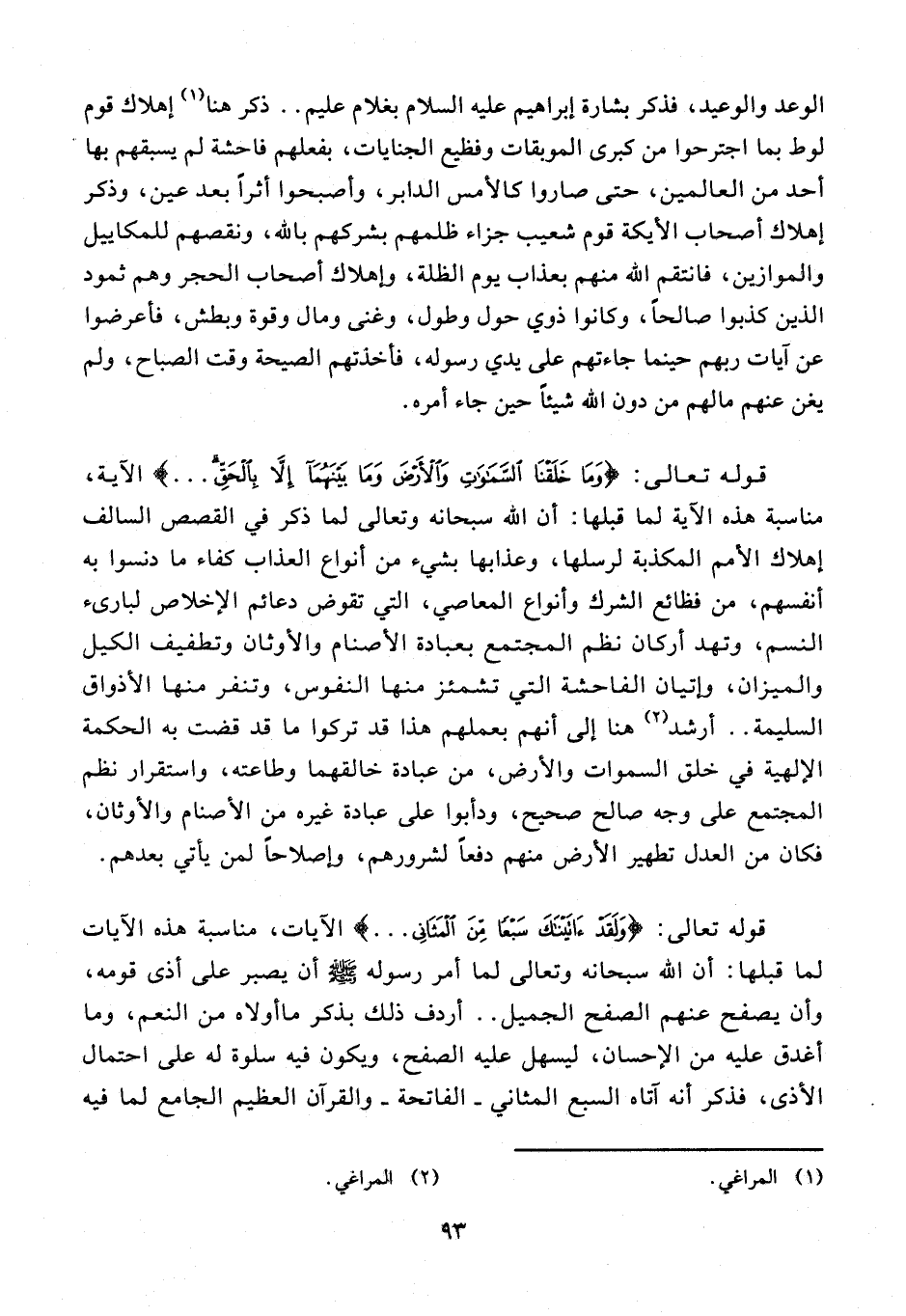 الوعد والوعيد، فذكر بشارة إبراهيم عليه السلام بغلام عليم .. ذكر هنا (¬1) إهلاك قوم لوط بما اجترحوا من كبرى الموبقات وفظيع الجنايات، بفعلهم فاحشة لم يسبقهم بها أحد من العالمين، حتى صاروا كالأمس الدابر، وأصبحوا أثرًا بعد عين، وذكر إهلاك أصحاب الأيكة قوم شعيب جزاء ظلمهم بشركهم بالله، ونقصهم للمكاييل والموازين، فانتقم الله منهم بعذاب يوم الظلة، وإهلاك أصحاب الحجر وهم ثمود الذين كذبوا صالحًا، وكانوا ذوي حول وطول، وغنى ومال وقوة وبطش، فأعرضوا عن آيات ربهم حينما جاءتهم على يدي رسوله، فأخذتهم الصيحة وقت الصباح، ولم يغن عنهم ما لهم من دون الله شيئًا حين جاء أمره.