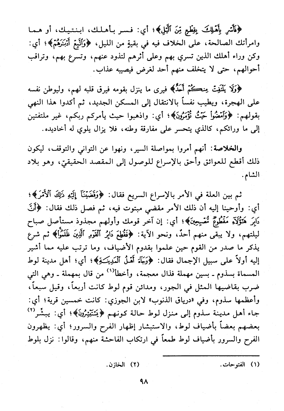{وَلَا يَلْتَفِتْ مِنْكُمْ أَحَدٌ} فيرى ما ينزل بقومه فيرق قلبه لهم، وليوطن نفسه على الهجرة، ويطيب نفسًا بالانتقال إلى المسكن الجديد، ثم أكدوا هذا النهي بقولهم: {وَامْضُوا حَيْثُ تُؤْمَرُونَ}؛ أي: واذهبوا حيث يأمركم ربكم، غير ملتفتين إلى ما ورائكم، كالذي يتحسر على مفارقة وطنه، فلا يزال يلوي له أخاديده.