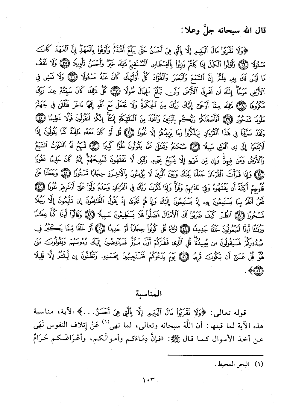 {وَلا تَقْرَبُوا مالَ الْيَتِيمِ إِلاَّ بِالَّتِي هِيَ أَحْسَنُ حَتَّى يَبْلُغَ أَشُدَّهُ وَأَوْفُوا بِالْعَهْدِ إِنَّ الْعَهْدَ كانَ مَسْؤُلًا (34) وَأَوْفُوا الْكَيْلَ إِذا كِلْتُمْ وَزِنُوا بِالْقِسْطاسِ الْمُسْتَقِيمِ ذلِكَ خَيْرٌ وَأَحْسَنُ تَأْوِيلًا (35) وَلا تَقْفُ ما لَيْسَ لَكَ بِهِ عِلْمٌ إِنَّ السَّمْعَ وَالْبَصَرَ وَالْفُؤادَ كُلُّ أُولئِكَ كانَ عَنْهُ مَسْؤُلًا (36) وَلا تَمْشِ فِي الْأَرْضِ مَرَحًا إِنَّكَ لَنْ تَخْرِقَ الْأَرْضَ وَلَنْ تَبْلُغَ الْجِبالَ طُولًا (37) كُلُّ ذلِكَ كانَ سَيِّئُهُ عِنْدَ رَبِّكَ مَكْرُوهًا (38) ذلِكَ مِمَّا أَوْحى إِلَيْكَ رَبُّكَ مِنَ الْحِكْمَةِ وَلا تَجْعَلْ مَعَ اللَّهِ إِلهًا آخَرَ فَتُلْقى فِي جَهَنَّمَ مَلُومًا مَدْحُورًا (39) أَفَأَصْفاكُمْ رَبُّكُمْ بِالْبَنِينَ وَاتَّخَذَ مِنَ الْمَلائِكَةِ إِناثًا إِنَّكُمْ لَتَقُولُونَ قَوْلًا عَظِيمًا (40) وَلَقَدْ صَرَّفْنا فِي هذَا الْقُرْآنِ لِيَذَّكَّرُوا وَما يَزِيدُهُمْ إِلاَّ نُفُورًا (41) قُلْ لَوْ كانَ مَعَهُ آلِهَةٌ كَما يَقُولُونَ إِذًا لابْتَغَوْا إِلى ذِي الْعَرْشِ سَبِيلًا (42) سُبْحانَهُ وَتَعالى عَمَّا يَقُولُونَ عُلُوًّا كَبِيرًا (43) تُسَبِّحُ لَهُ السَّماواتُ السَّبْعُ وَالْأَرْضُ وَمَنْ فِيهِنَّ وَإِنْ مِنْ شَيْءٍ إِلاَّ يُسَبِّحُ بِحَمْدِهِ وَلكِنْ لا تَفْقَهُونَ تَسْبِيحَهُمْ إِنَّهُ كانَ حَلِيمًا غَفُورًا (44) وَإِذا قَرَأْتَ الْقُرْآنَ جَعَلْنا بَيْنَكَ وَبَيْنَ الَّذِينَ لا يُؤْمِنُونَ بِالْآخِرَةِ حِجابًا مَسْتُورًا (45) وَجَعَلْنا عَلى قُلُوبِهِمْ أَكِنَّةً أَنْ يَفْقَهُوهُ وَفِي آذانِهِمْ وَقْرًا وَإِذا ذَكَرْتَ رَبَّكَ فِي الْقُرْآنِ وَحْدَهُ وَلَّوْا عَلى أَدْبارِهِمْ نُفُورًا (46) نَحْنُ أَعْلَمُ بِما يَسْتَمِعُونَ بِهِ إِذْ يَسْتَمِعُونَ إِلَيْكَ وَإِذْ هُمْ نَجْوى إِذْ يَقُولُ الظَّالِمُونَ إِنْ تَتَّبِعُونَ إِلاَّ رَجُلًا مَسْحُورًا (47) انْظُرْ كَيْفَ ضَرَبُوا لَكَ الْأَمْثالَ فَضَلُّوا فَلا يَسْتَطِيعُونَ سَبِيلًا (48) وَقالُوا أَإِذا كُنَّا عِظامًا وَرُفاتًا أَإِنَّا لَمَبْعُوثُونَ خَلْقًا جَدِيدًا (49) قُلْ كُونُوا حِجارَةً أَوْ حَدِيدًا (50) أَوْ خَلْقًا مِمَّا يَكْبُرُ فِي صُدُورِكُمْ فَسَيَقُولُونَ مَنْ يُعِيدُنا قُلِ الَّذِي فَطَرَكُمْ أَوَّلَ مَرَّةٍ فَسَيُنْغِضُونَ إِلَيْكَ رُؤُسَهُمْ وَيَقُولُونَ مَتى هُوَ قُلْ عَسى أَنْ يَكُونَ قَرِيبًا (51) يَوْمَ يَدْعُوكُمْ فَتَسْتَجِيبُونَ بِحَمْدِهِ وَتَظُنُّونَ إِنْ لَبِثْتُمْ إِلاَّ قَلِيلًا (52)}.