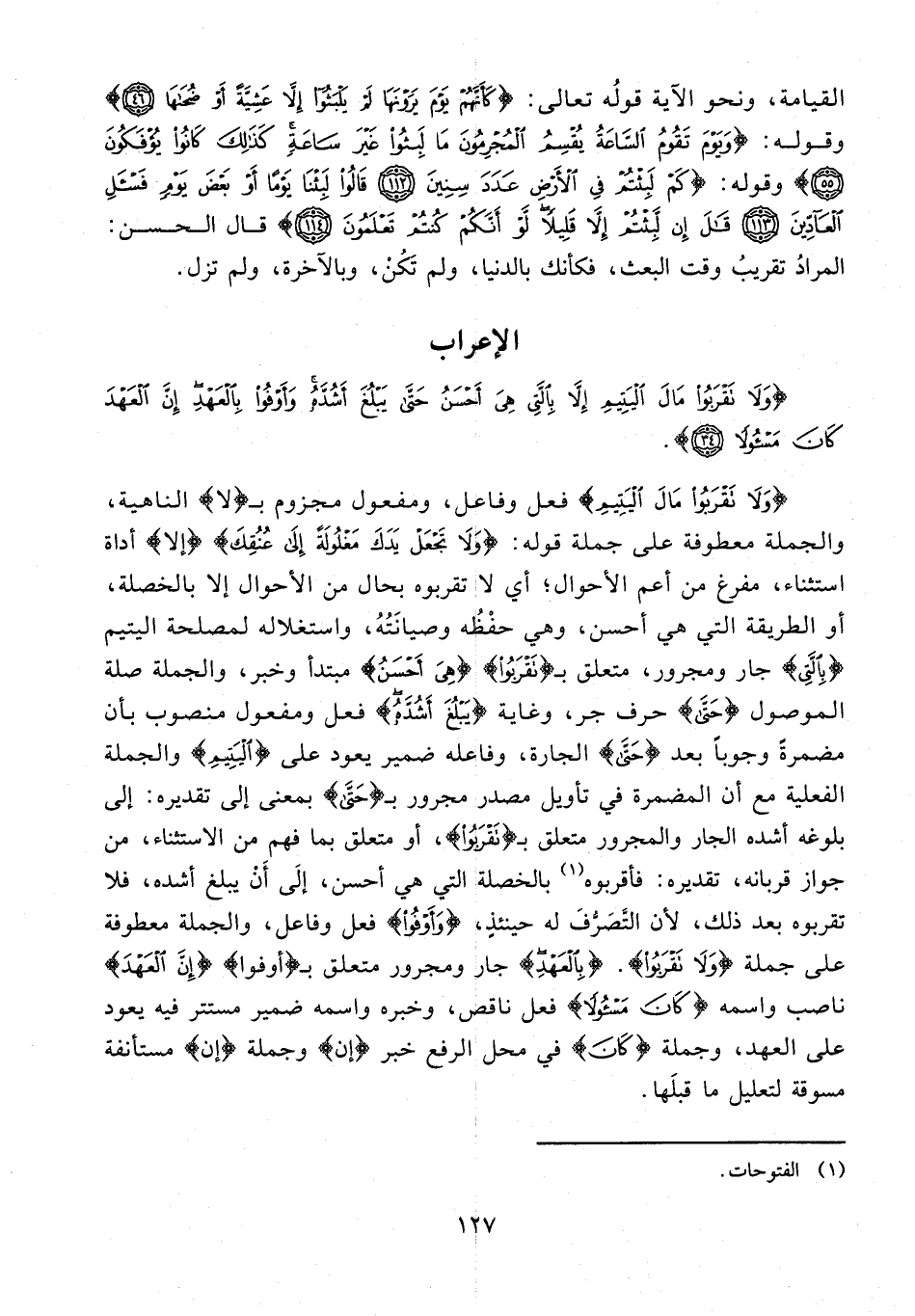 {وَلا تَقْرَبُوا مالَ الْيَتِيمِ} فعل وفاعل، ومفعول مجزوم بـ {لا} الناهية، والجملة معطوفة على جملة قوله: {وَلا تَجْعَلْ يَدَكَ مَغْلُولَةً إِلى عُنُقِكَ} {إِلَّا} أداة استثناء، مفرغ من أعم الأحوال؛ أي لا تقربوه بحال من الأحوال إلا بالخصلة، أو الطريقة التي هي أحسن، وهي حفظه وصيانته، واستغلاله لمصلحة اليتيم {بِالَّتِي} جار ومجرور، متعلق بـ {تَقْرَبُوا} {هِيَ أَحْسَنُ} مبتدأ وخبر، والجملة صلة الموصول {حَتَّى} حرف جر، وغاية {يَبْلُغَ أَشُدَّهُ} فعل ومفعول منصوب بأن مضمرة وجوبًا بعد {حَتَّى} الجارة، وفاعله ضمير يعود على {الْيَتِيمِ} والجملة الفعلية مع أن المضمرة في تأويل مصدر مجرور بـ {حَتَّى} بمعنى إلى تقديره: إلى بلوغه أشده الجار والمجرور متعلق بـ {تَقْرَبُوا}، أو متعلق بما فهم من الاستثناء، من جواز قربانه، تقديره: فأقربوه (¬1) بالخصلة التي هي أحسن، إلى أن يبلغ أشده، فلا تقربوه بعد ذلك، لأن التّصرّف له حينئذ، {وَأَوْفُوا} فعل وفاعل، والجملة معطوفة على جملة {وَلا تَقْرَبُوا}. {بِالْعَهْدِ} جار ومجرور متعلق بـ {أَوْفُوا} {إِنَّ الْعَهْدَ} ناصب واسمه {كانَ مَسْؤُلًا} فعل ناقص، وخبره واسمه ضمير مستتر فيه يعود على العهد، وجملة {كانَ} في محل الرفع خبر {إِنَّ} وجملة {إِنَّ} مستأنفة مسوقة لتعليل ما قبلها.