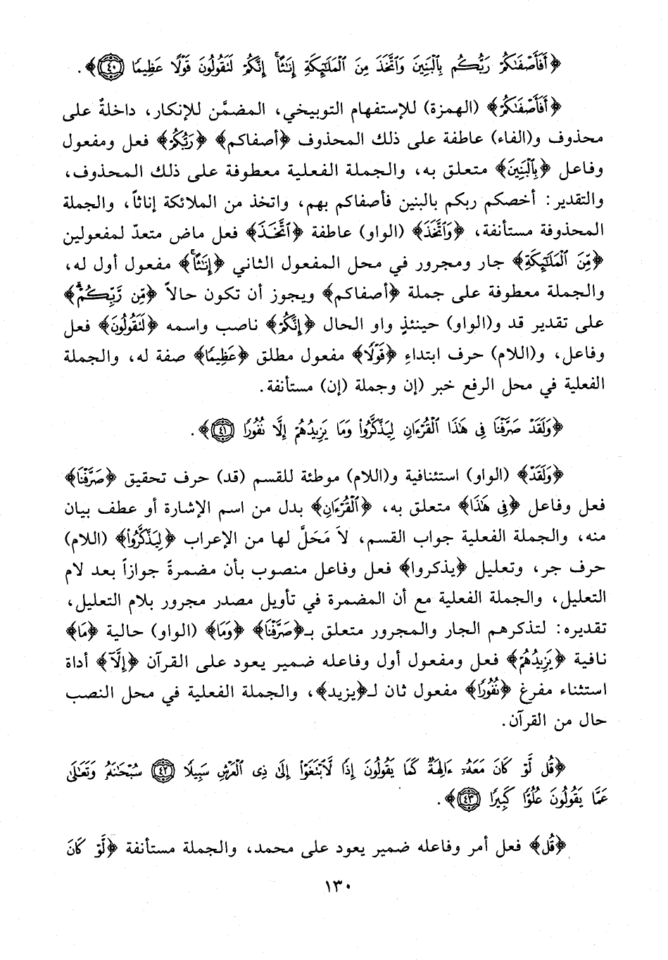 {أَفَأَصْفاكُمْ} {الهمزة} للإستفهام التوبيخي، المضمَّن للإنكار، داخلة على محذوف و {الفاء} عاطفة على ذلك المحذوف {أصفاكم} {رَبُّكُمْ} فعل ومفعول وفاعل {بِالْبَنِينَ} متعلق به، والجملة الفعلية معطوفة على ذلك المحذوف، والتقدير: أخصكم ربكم بالبنين فأصفاكم بهم، واتخذ من الملائكة إناثا، والجملة المحذوفة مستأنفة، {وَاتَّخَذَ} {الواو} عاطفة {اتَّخَذَ} فعل ماض متعدّ لمفعولين {مِنَ الْمَلائِكَةِ} جار ومجرور في محل المفعول الثاني {إِناثًا} مفعول أول له، والجملة معطوفة على جملة {أصفاكم} ويجوز أن تكون حالًا {من ربكم} على تقدير قد و {الواو} حينئذ واو الحال {إِنَّكُمْ} ناصب واسمه {لَتَقُولُونَ} فعل وفاعل، و {اللام} حرف ابتداء {قَوْلًا} مفعول مطلق {عَظِيمًا} صفة له، والجملة الفعلية في محل الرفع خبر {إن} وجملة {إن} مستأنفة.