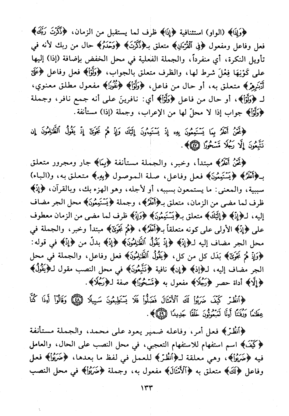 {وَإِذا} {الواو} استئنافية {إِذا} ظرف لما يستقبل من الزمان، {ذَكَرْتَ رَبَّكَ} فعل وفاعل ومفعول {فِي الْقُرْآنِ} متعلق بـ {ذَكَرْتَ} {وَحْدَهُ} حال من ربك لأنه في تأويل النكرة، أي منفردًا، والجملة الفعلية في محل الخفض بإضافة {إِذا} إليها على كونها فعل شرط لها، والظرف متعلق بالجواب، {وَلَّوْا} فعل وفاعل {عَلى أَدْبارِهِمْ} متعلق به، أو حال من فاعل، {وَلَّوْا نُفُورًا} مفعول مطلق معنوي، لـ {وَلَّوْا}، أو حال من فاعل {وَلَّوْا} أي: نافرين على أنه جمع نافر، وجملة {وَلَّوْا} جواب إذا لا محلّ لها من الإعراب، وجملة {إِذا} مستأنفة.