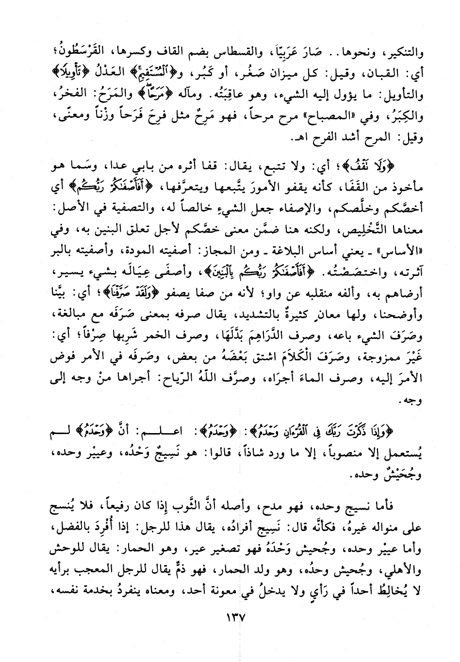 {وَلا تَقْفُ}؛ أي: ولا تتبع، يقال: قفا أثره من بابي عدا، وسما هو مأخوذ من القفا، كأنه يقفو الأمور يتّبعها ويتعرّفها، {أَفَأَصْفاكُمْ رَبُّكُمْ} أي أخصّكم وخلّصكم، والإصفاء جعل الشيء خالصًا له، والتصفية في الأصل: معناها التّخليص، ولكنه هنا ضمّن معنى خصّكم لأجل تعلق البنين به، وفي «الأساس» - يعني أساس البلاغة - ومن المجاز: أصفيته المودة، وأصفيته بالبر آثرته، واختصصته. {أَفَأَصْفاكُمْ رَبُّكُمْ بِالْبَنِينَ}، وأصفى عياله بشيء يسير، أرضاهم به، وألفه منقلبه عن واو؛ لأنه من صفا يصفو {وَلَقَدْ صَرَّفْنا}؛ أي: بيّنا وأوضحنا، ولها معان كثيرة بالتشديد، يقال صرفه بمعنى صرفه مع مبالغة، وصرف الشيء باعه، وصرف الدّراهم بدّلها، وصرف الخمر شربها صرفًا؛ أي: غير ممزوجة، وصرف الكلام اشتق بعضه من بعض، وصرفه في الأمر فوض الأمر إليه، وصرف الماء أجراه، وصرّف الله الرّياح: أجراها من وجه إلى وجه.