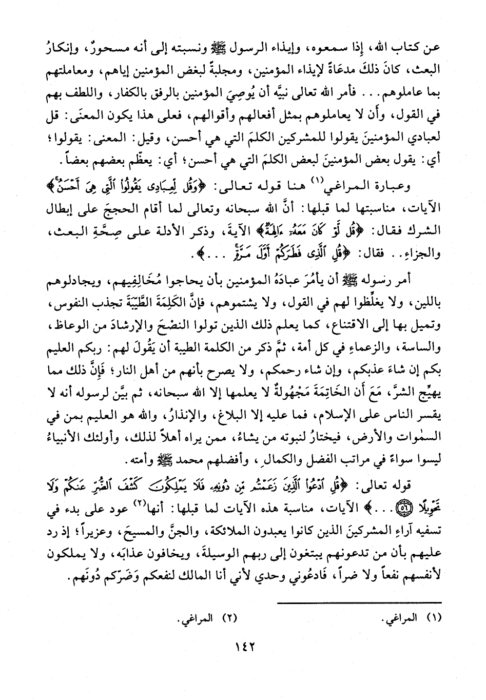 وعبارة المراغي (¬1) هنا قوله تعالى: {وَقُلْ لِعِبادِي يَقُولُوا الَّتِي هِيَ أَحْسَنُ} الآيات، مناسبتها لما قبلها: أنّ الله سبحانه وتعالى لما أقام الحجج على إبطال الشرك فقال: {قُلْ لَوْ كانَ مَعَهُ آلِهَةٌ} الآية، وذكر الأدلة على صحّة البعث، والجزاء .. فقال: {قُلِ الَّذِي فَطَرَكُمْ أَوَّلَ مَرَّةٍ ....}.