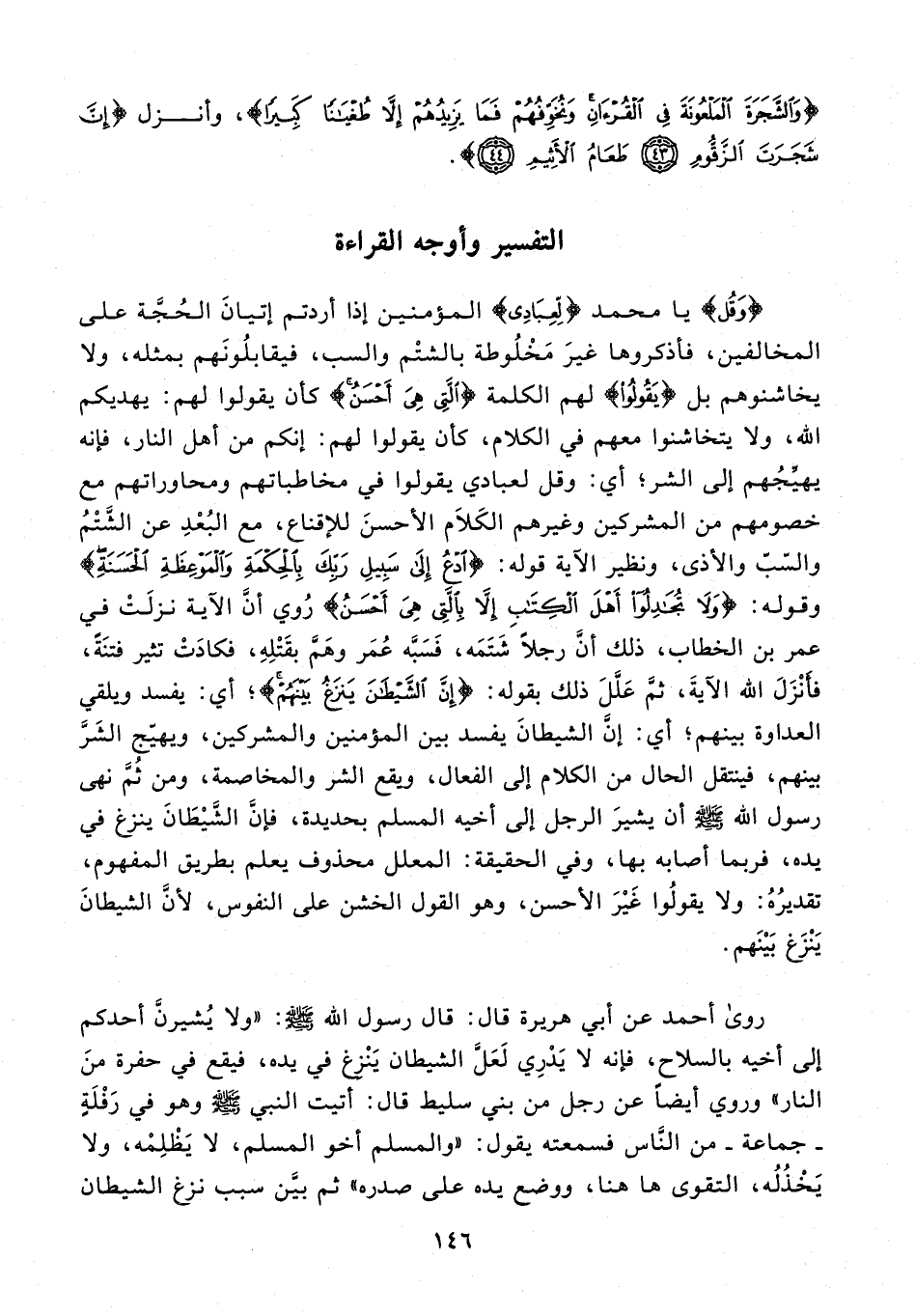 53 - {وَقُلْ} يا محمد {لِعِبادِي} المؤمنين إذا أردتم إتيان الحجّة على المخالفين، فأذكروها غير مخلوطة بالشتم والسب، فيقابلونهم بمثله، ولا يخاشنوهم بل {يَقُولُوا} لهم الكلمة {الَّتِي هِيَ أَحْسَنُ} كأن يقولوا لهم: يهديكم الله، ولا يتخاشنوا معهم في الكلام، كأن يقولوا لهم: إنكم من أهل النار، فإنه يهيّجهم إلى الشر؛ أي: وقل لعبادي يقولوا في مخاطباتهم ومحاوراتهم مع خصومهم من المشركين وغيرهم الكلام الأحسن للإقناع، مع البعد عن الشّتم والسّبّ والأذى، ونظير الآية قوله: {ادْعُ إِلى سَبِيلِ رَبِّكَ بِالْحِكْمَةِ وَالْمَوْعِظَةِ الْحَسَنَةِ} وقوله: {وَلا تُجادِلُوا أَهْلَ الْكِتابِ إِلَّا بِالَّتِي هِيَ أَحْسَنُ} روي أنّ الآية نزلت في عمر بن الخطاب، ذلك أنّ رجلا شتمه، فسبّه عمر وهمّ بقتله، فكادت تثير فتنة، فأنزل الله الآية، ثمّ علّل ذلك بقوله: {إِنَّ الشَّيْطانَ يَنْزَغُ بَيْنَهُمْ}؛ أي: يفسد ويلقي العداوة بينهم؛ أي: إنّ الشيطان يفسد بين المؤمنين والمشركين، ويهيّج الشرّ بينهم، فينتقل الحال من الكلام إلى الفعال، ويقع الشر والمخاصمة، ومن ثمّ نهى رسول الله - صلى الله عليه وسلم - أن يشير الرجل إلى أخيه المسلم بحديدة، فإنّ الشّيطان ينزغ في يده، فربما أصابه بها، وفي الحقيقة: المعلل محذوف يعلم بطريق المفهوم، تقديره: ولا يقولوا غير الأحسن، وهو القول الخشن على النفوس، لأنّ الشيطان ينزغ بينهم.