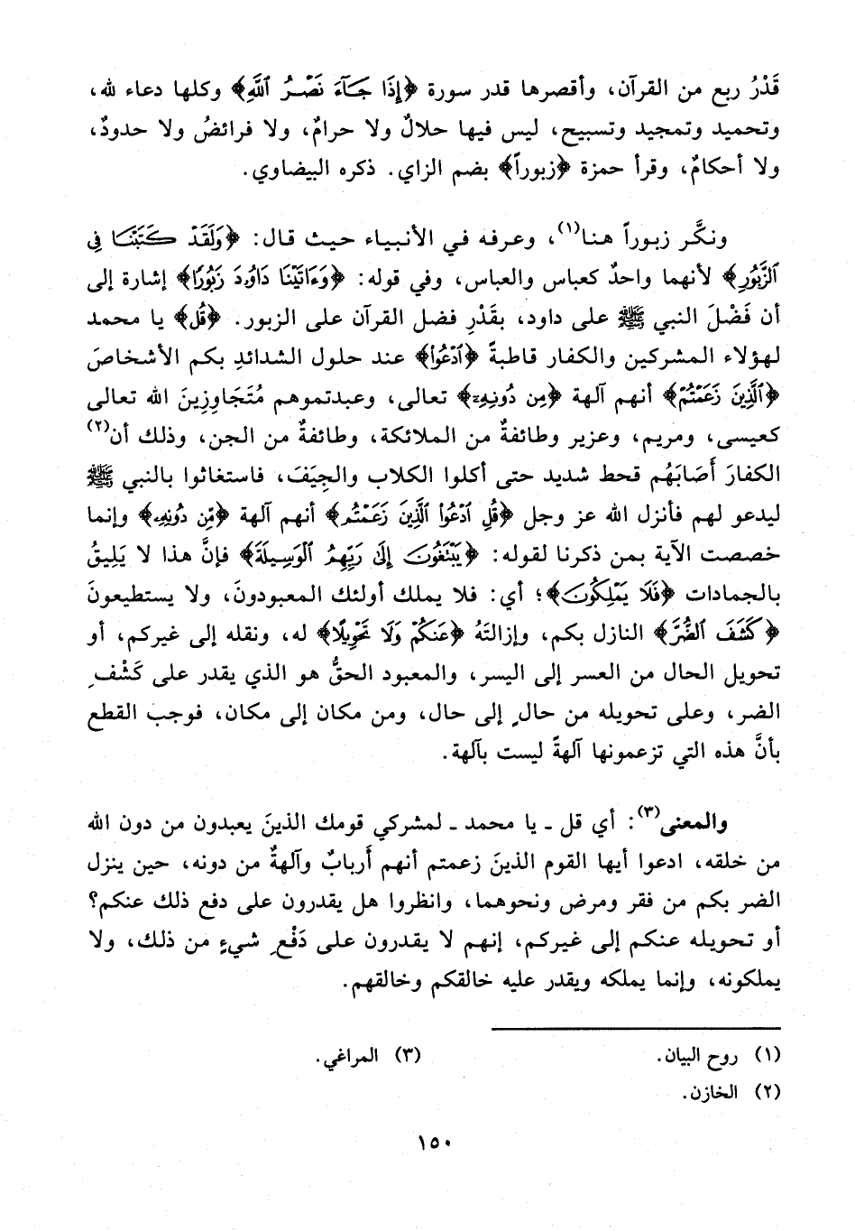 قدر ربع من القرآن، وأقصرها قدر سورة {إِذا جاءَ نَصْرُ اللَّهِ} وكلها دعاء لله، وتحميد وتمجيد وتسبيح، ليس فيها حلالٌ ولا حرامٌ، ولا فرائضٌ ولا حدودٌ، ولا أحكامٌ، وقرأ حمزة {زبورًا} بضم الزاي. ذكره البيضاوي.