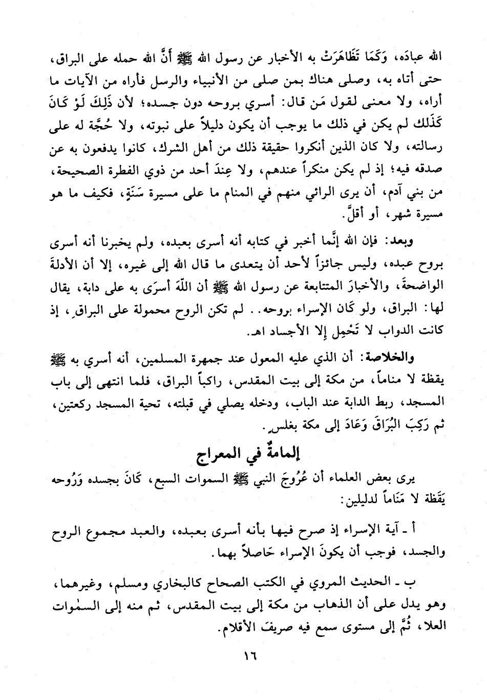 وبعد: فإن الله إنّما أخبر في كتابه أنه أسرى بعبده، ولم يخبرنا أنه أسرى بروح عبده، وليس جائزًا لأحد أن يتعدى ما قال الله إلى غيره، إلا أن الأدلة الواضحة، والأخبار المتتابعة عن رسول الله - صلى الله عليه وسلم - أن الله أسرى به على دابة، يقال لها: البراق، ولو كان الإسراء بروحه .. لم تكن الروح محمولة على البراق، إذ كانت الدواب لا تحمل إلا الأجساد اهـ.