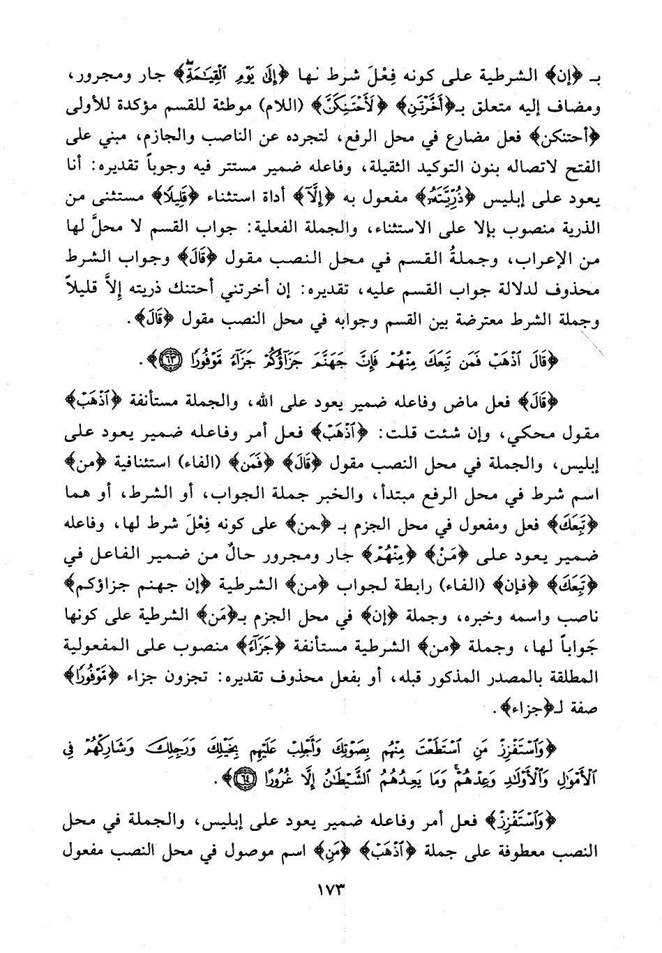 {قالَ} فعل ماض وفاعله ضمير يعود على الله، والجملة مستأنفة {اذْهَبْ} مقول محكي، وإن شئت قلت: {اذْهَبْ} فعل أمر وفاعله ضمير يعود على إبليس، والجملة في محل النصب مقول {قالَ} {فَمَنْ} {الفاء} استئنافية {من} اسم شرط في محل الرفع مبتدأ، والخبر جملة الجواب، أو الشرط، أو هما {تَبِعَكَ} فعل ومفعول في محل الجزم بـ {من} على كونه فعل شرط لها، وفاعله ضمير يعود على {من} {مِنْهُمْ} جار ومجرور حال من ضمير الفاعل في {تَبِعَكَ} {فَإِنَّ} {الفاء} رابطة لجواب {من} الشرطية {إن جهنم جزاؤكم} ناصب واسمه وخبره، وجملة {إن} في محل الجزم بـ {من} الشرطية على كونها جوابًا لها، وجملة {من} الشرطية مستأنفة {جَزاءً} منصوب على المفعولية المطلقة بالمصدر المذكور قبله، أو بفعل محذوف تقديره: تجزون جزاء {مَوْفُورًا} صفة لـ {جَزاءً}.