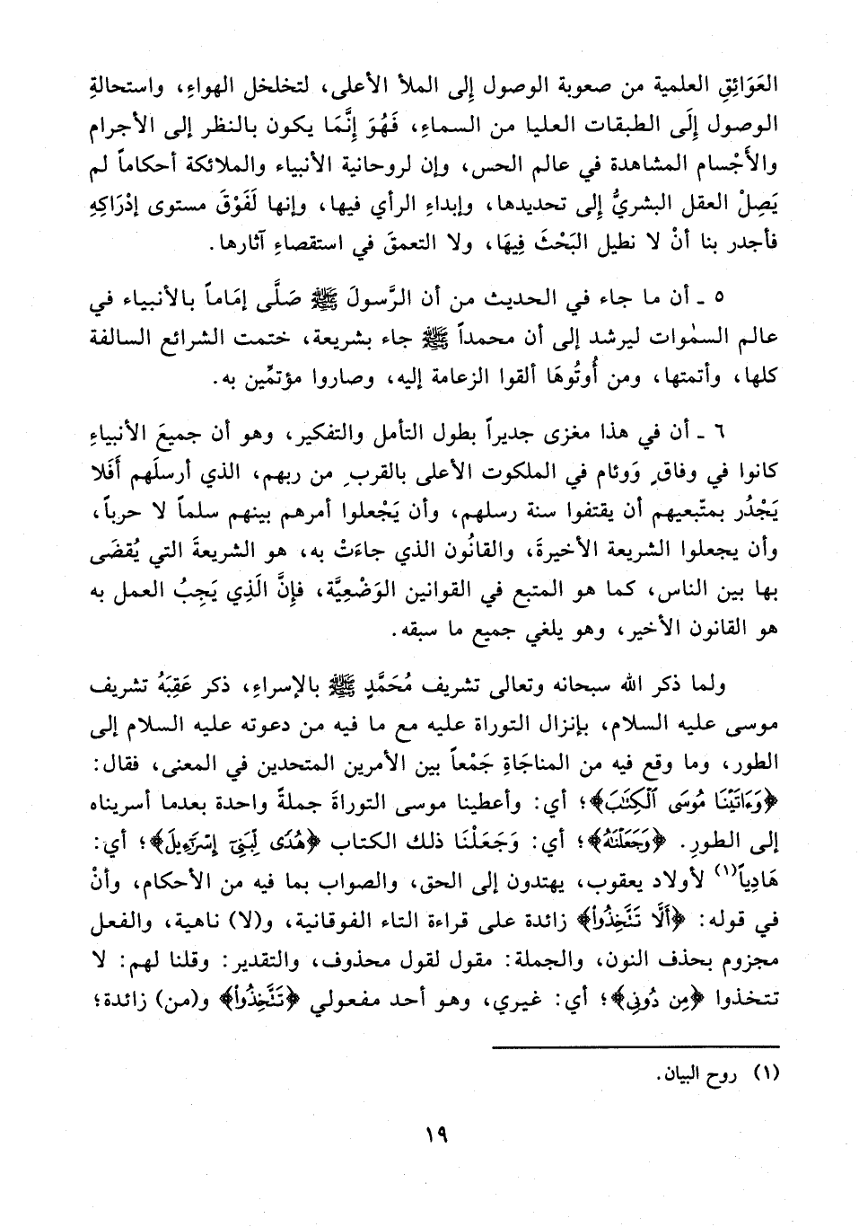 6 - أن في هذا مغزى جديرًا بطول التأمل والتفكير، وهو أن جميع الأنبياء كانوا في وفاقٍ ووئام في الملكوت الأعلى بالقرب من ربهم، الذي أرسلهم أفلا يجدر بمتّبعيهم أن يقتفوا سنة رسلهم، وأن يجعلوا أمرهم بينهم سلما لا حربا، وأن يجعلوا الشريعة الأخيرة، والقانون الذي جاءت به، هو الشريعة التي يقضى بها بين الناس، كما هو المتبع في القوانين الوضعيّة، فإنّ الذي يجب العمل به هو القانون الأخير، وهو يلغي جميع ما سبقه.