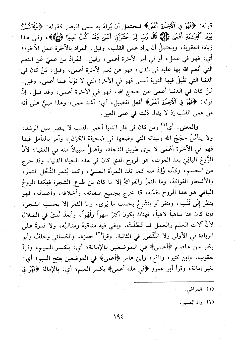 قوله: {فَهُوَ فِي الْآخِرَةِ أَعْمى} فيحتمل أن يراد به عمى البصر كقوله: {وَنَحْشُرُهُ يَوْمَ الْقِيامَةِ أَعْمى (124) قالَ رَبِّ لِمَ حَشَرْتَنِي أَعْمى وَقَدْ كُنْتُ بَصِيرًا (125)}، وفي هذا زيادة العقوبة، ويحتمل أن يراد عمى القلب، وقيل: المراد بالآخرة عمل الآخرة؛ أي: فهو في عمل، أو في أمر الآخرة أعمى، وقيل: المراد من عمي عن النعم التي أنعم الله بها عليه في الدنيا، فهو عن نعم الآخرة أعمى، وقيل: من كان في الدنيا التي تقبل فيها التوبة أعمى فهو في الآخرة التي لا توبة فيها أعمى، وقيل: من كان في الدنيا أعمى عن حجج الله، فهو في الآخرة أعمى، وقد قيل: إنّ قوله: {فَهُوَ فِي الْآخِرَةِ أَعْمَى} أفعل تفضيل، أي: أشد عمى، وهذا مبنيٌّ على أنه من عمى القلب إذ لا يقال ذلك في عمى العين.